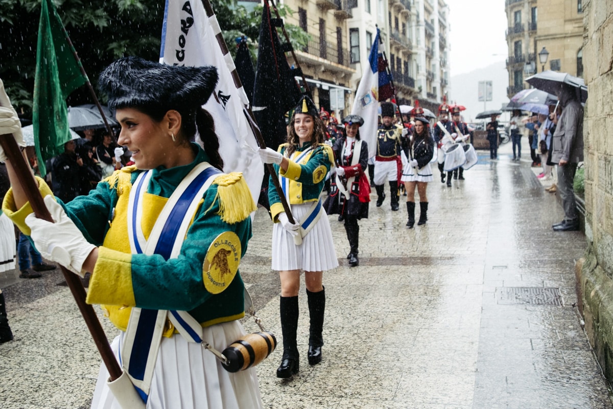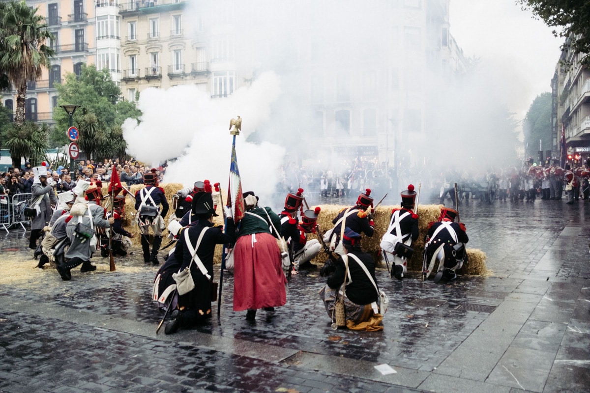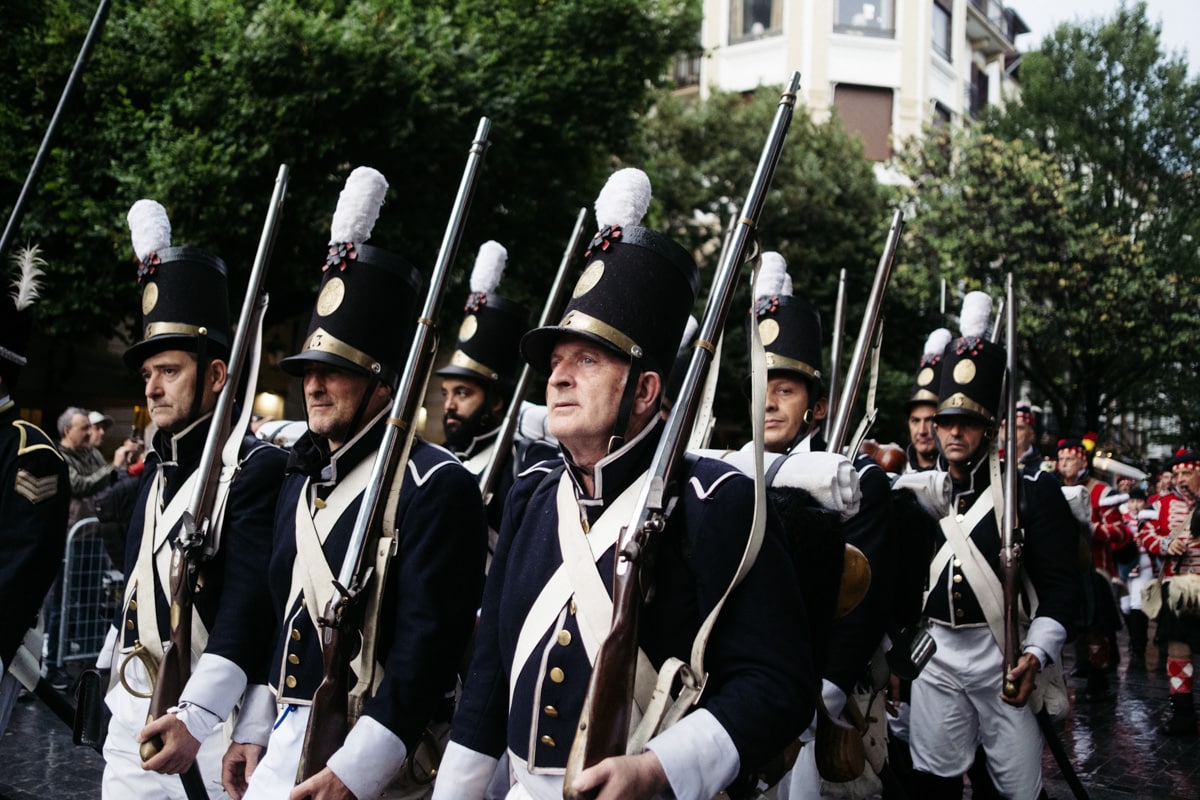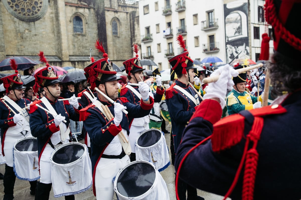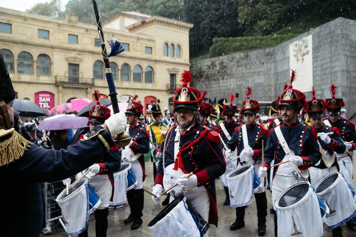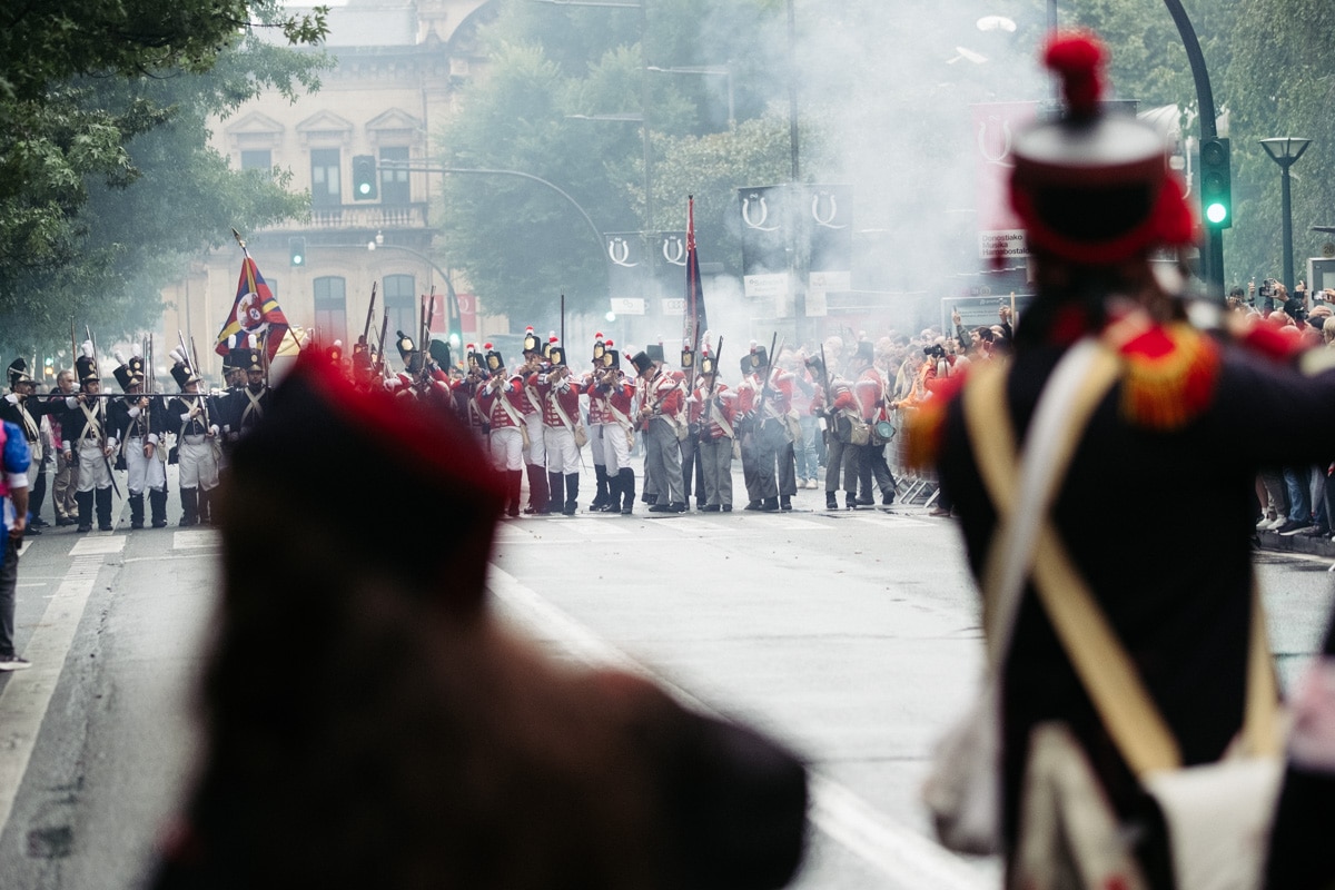 No perdonó la lluvia el pasado año la conmemoración del 31 de Agosto en Donostia y tampoco ha querido faltar hoy. Este domingo no ha podido presentarse más desapacible pese a la buena voluntad de todos los participantes en la recreación del aniversario de la quema de la ciudad en 1813.