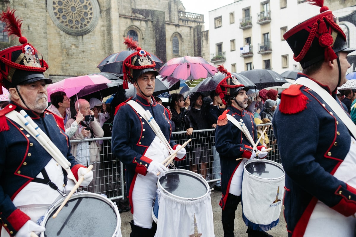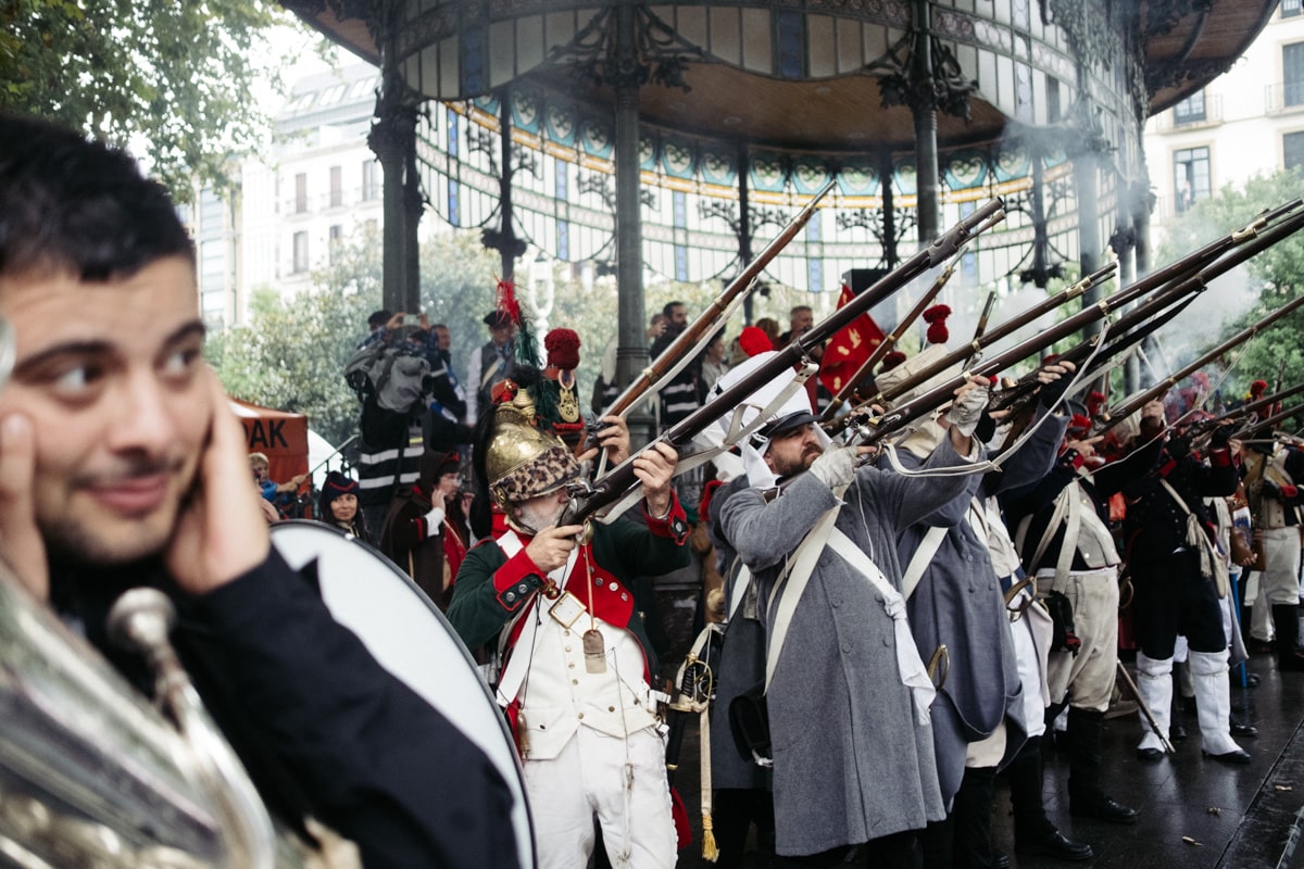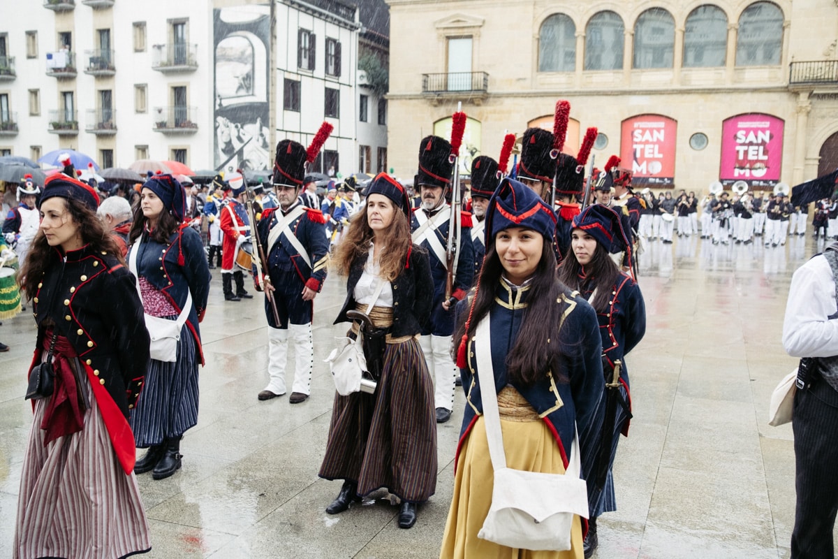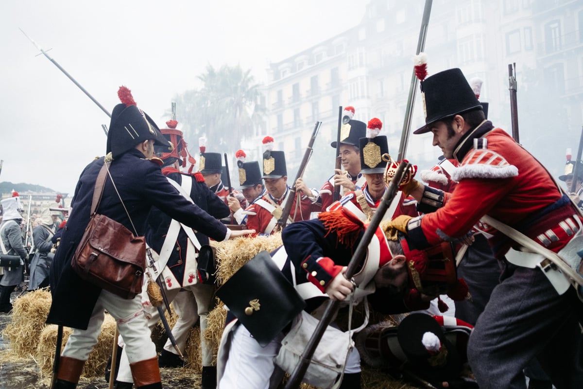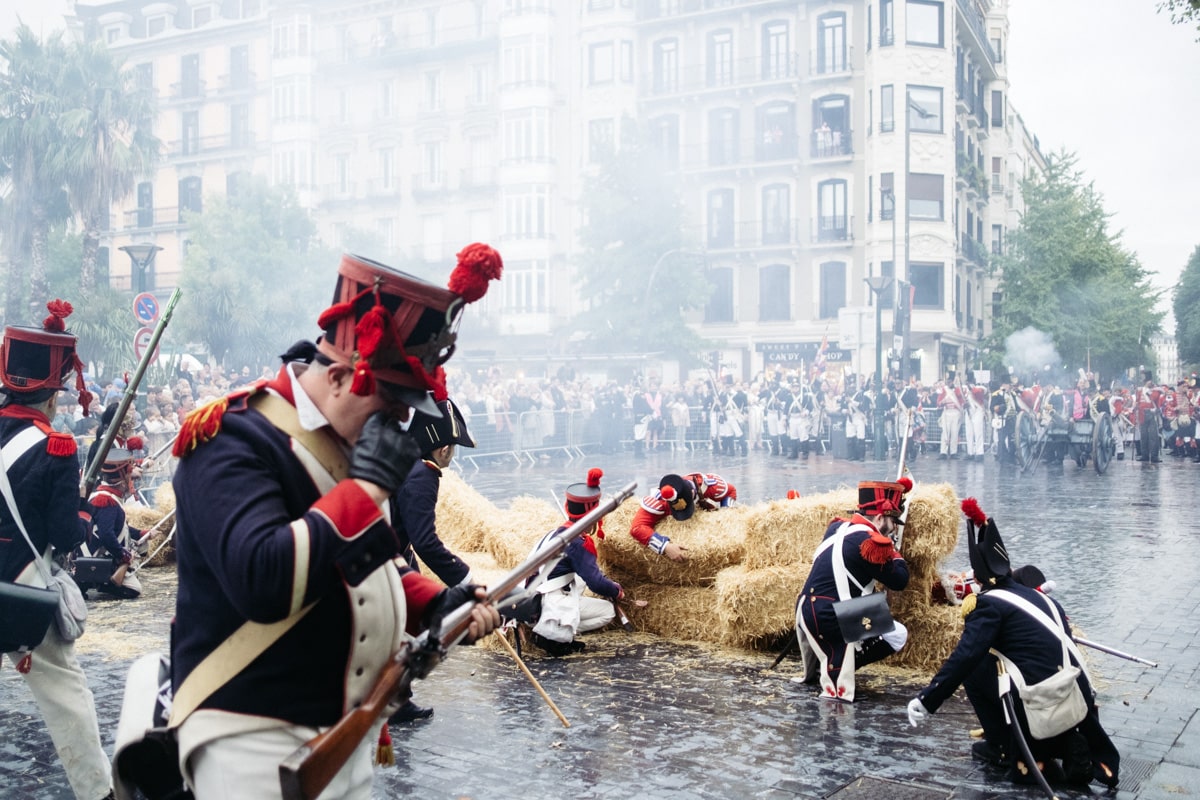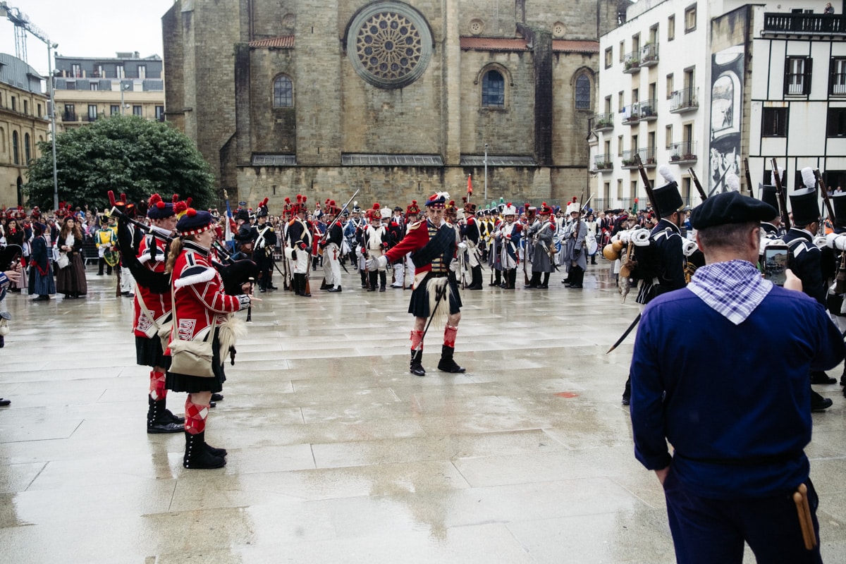 No perdonó la lluvia el pasado año la conmemoración del 31 de Agosto en Donostia y tampoco ha querido faltar hoy. Este domingo no ha podido presentarse más desapacible pese a la buena voluntad de todos los participantes en la recreación del aniversario de la quema de la ciudad en 1813.