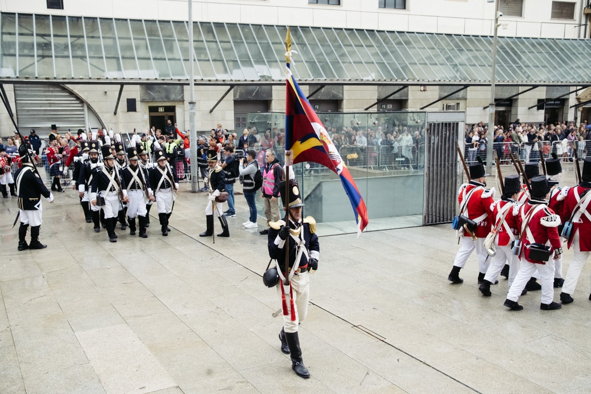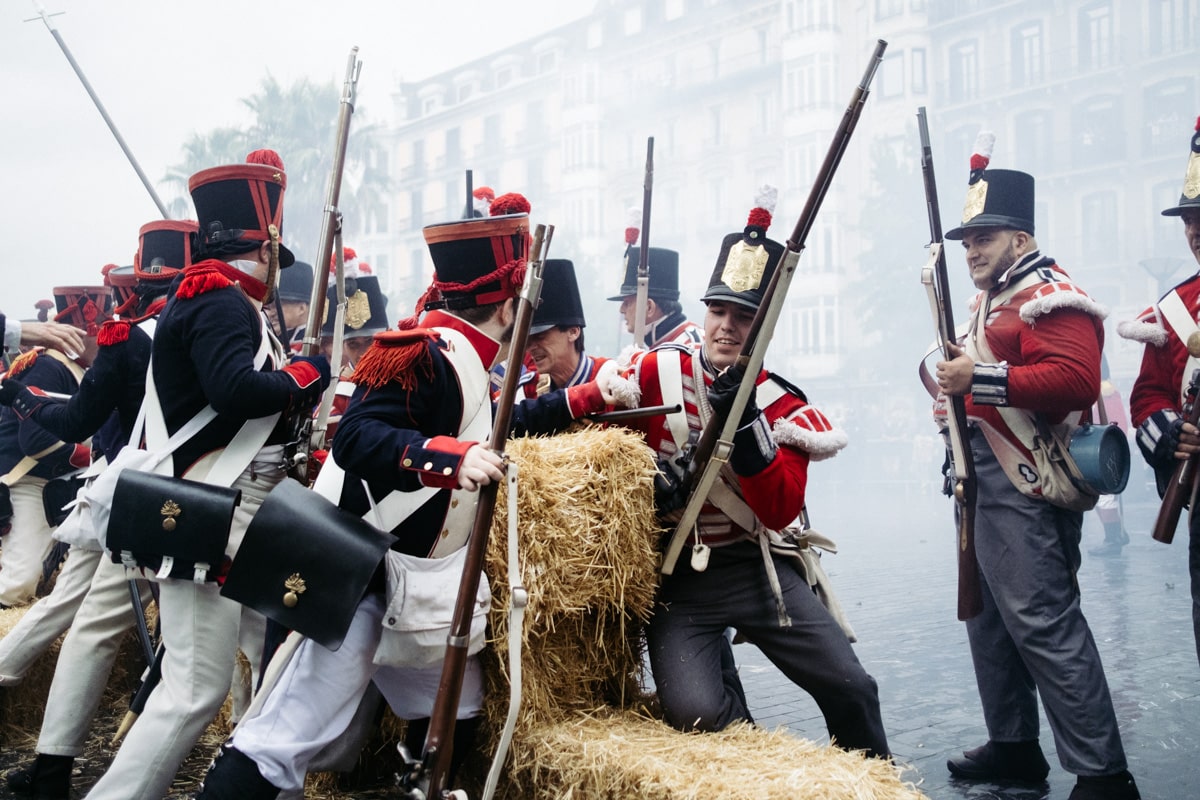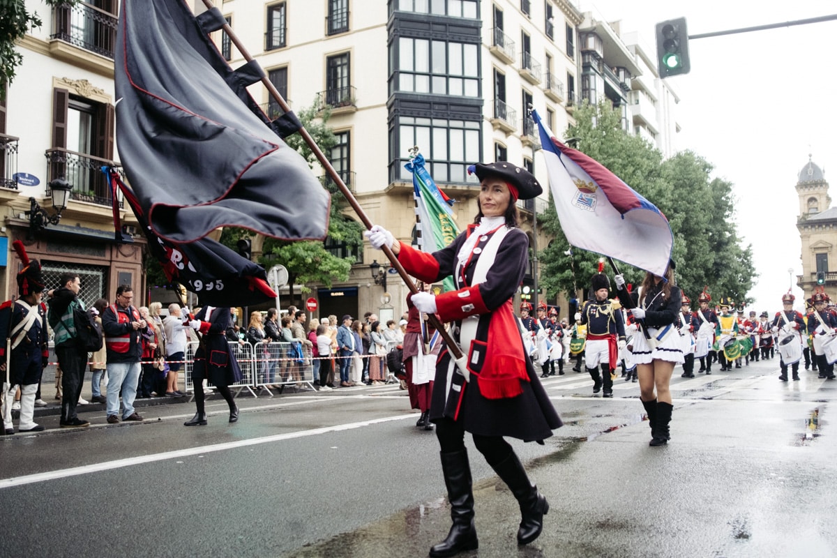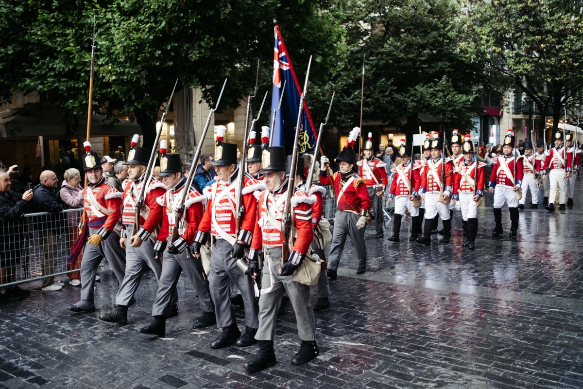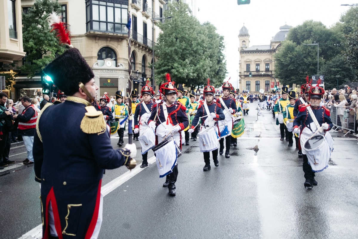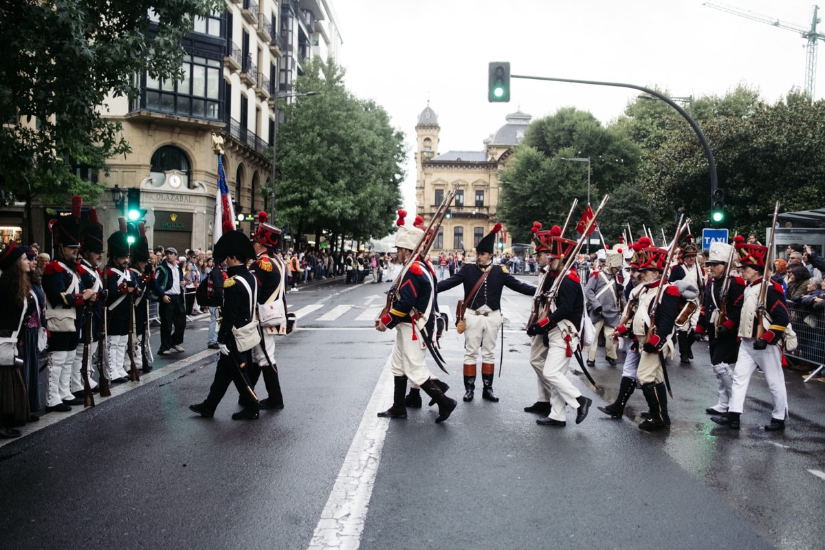 No perdonó la lluvia el pasado año la conmemoración del 31 de Agosto en Donostia y tampoco ha querido faltar hoy. Este domingo no ha podido presentarse más desapacible pese a la buena voluntad de todos los participantes en la recreación del aniversario de la quema de la ciudad en 1813.