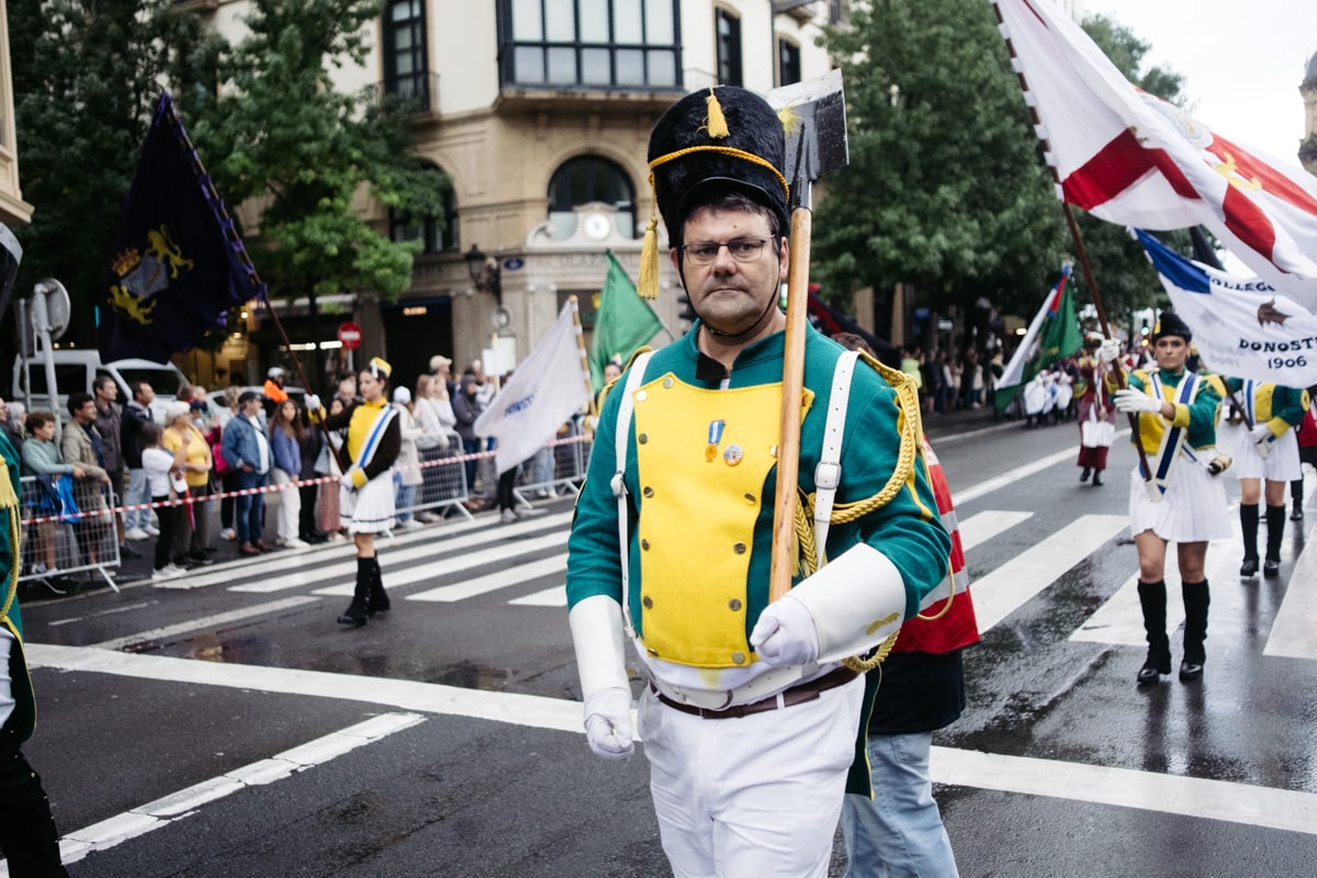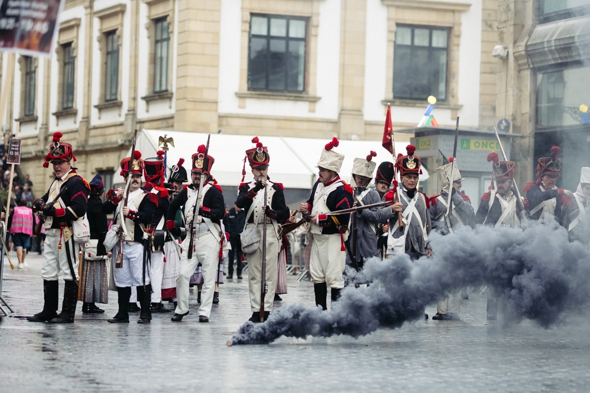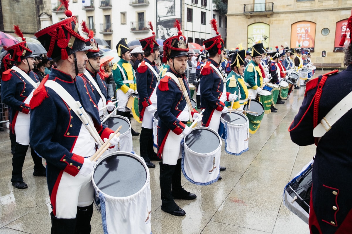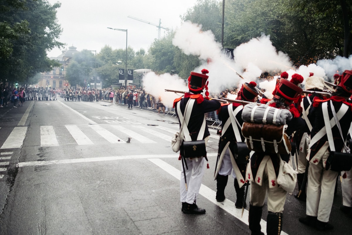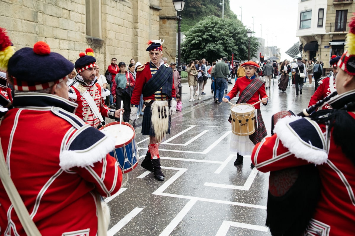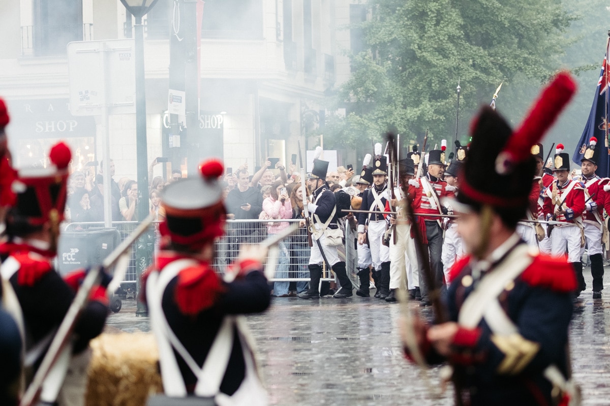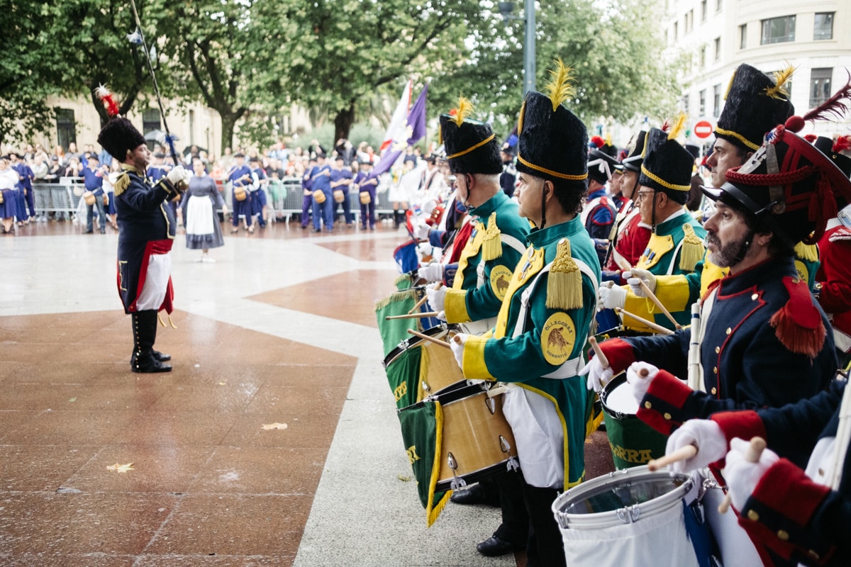 No perdonó la lluvia el pasado año la conmemoración del 31 de Agosto en Donostia y tampoco ha querido faltar hoy. Este domingo no ha podido presentarse más desapacible pese a la buena voluntad de todos los participantes en la recreación del aniversario de la quema de la ciudad en 1813.