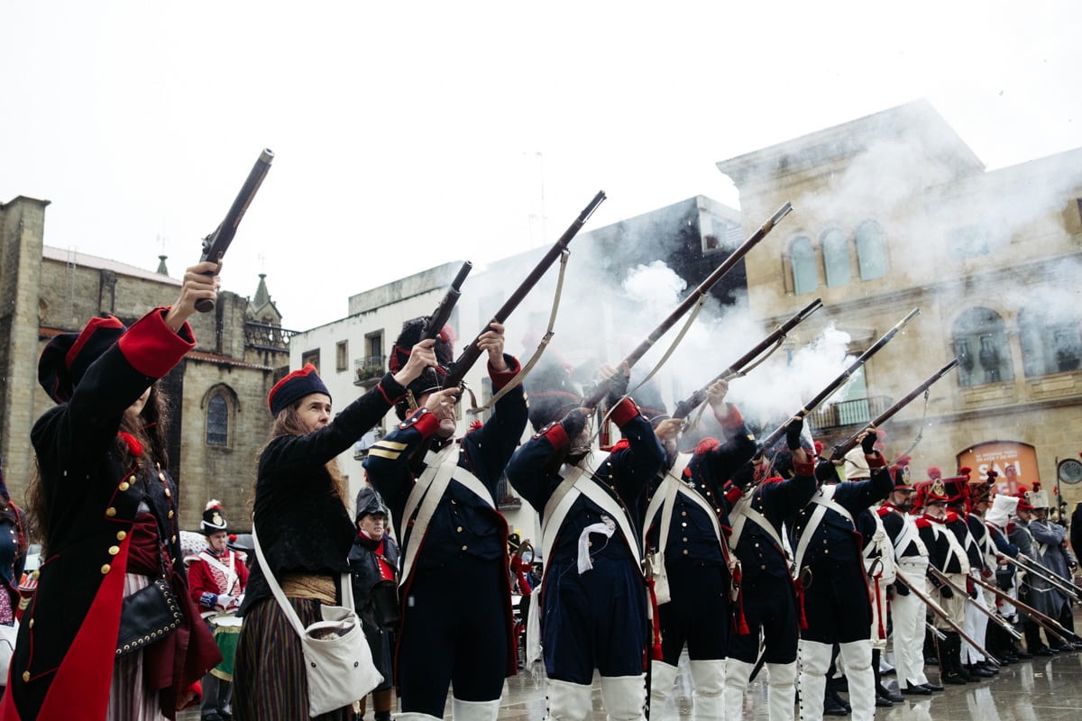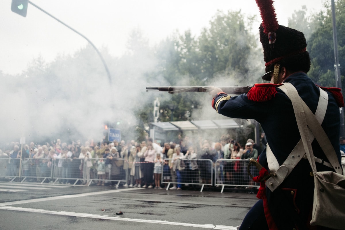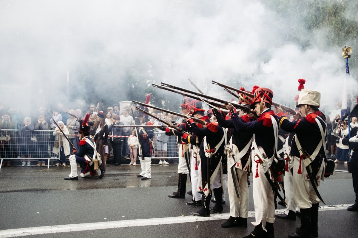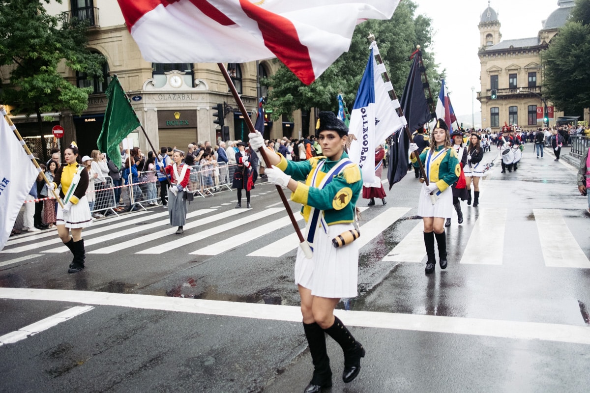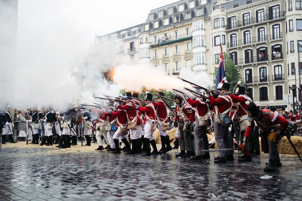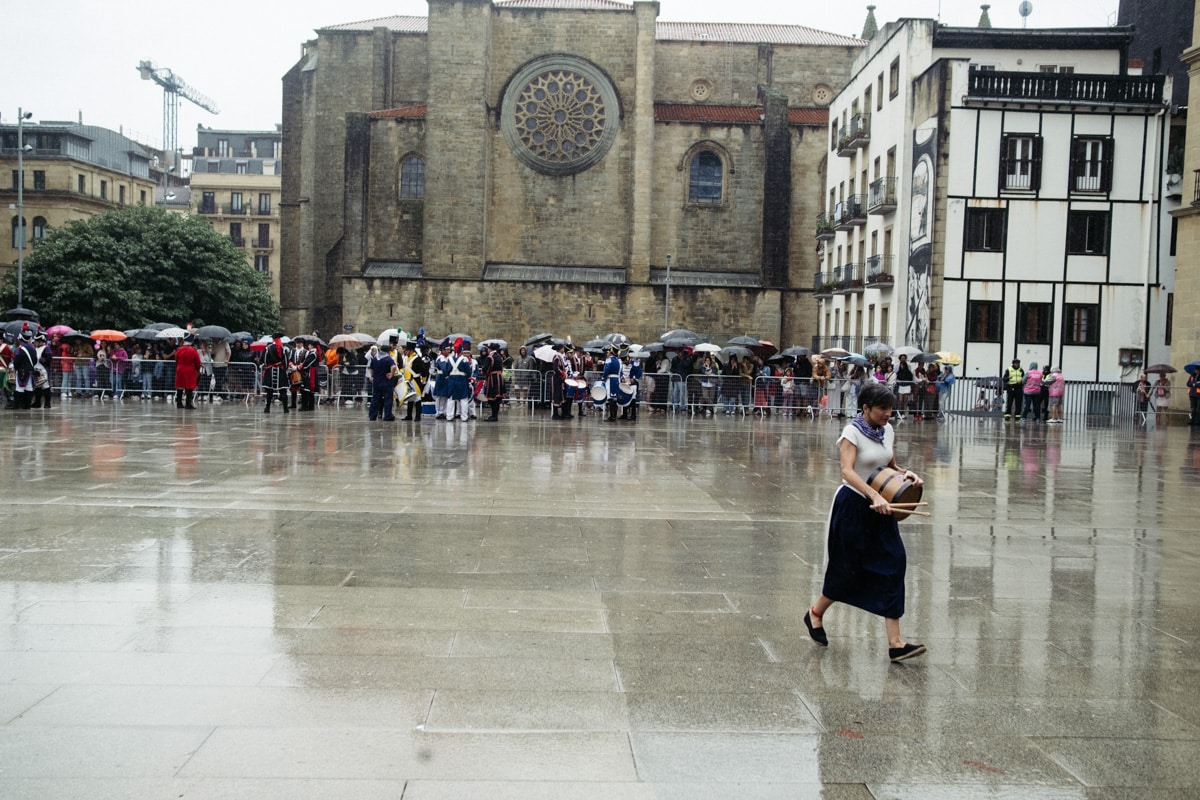 No perdonó la lluvia el pasado año la conmemoración del 31 de Agosto en Donostia y tampoco ha querido faltar hoy. Este domingo no ha podido presentarse más desapacible pese a la buena voluntad de todos los participantes en la recreación del aniversario de la quema de la ciudad en 1813.