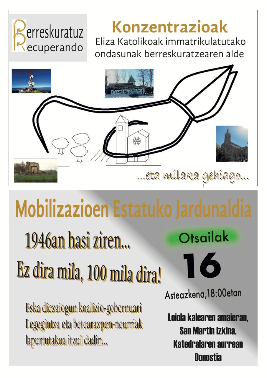 Asociaciones como Europa Laica y Erreskuratuz/Recuperando han convocado este miércoles 16 manifestaciones en una veintena de localidades del Estado «para exigir información suficiente de todas las inmatriculaciones de la Iglesia, la recuperación de los bienes inmatriculados y la defensa del patrimonio público». En Donostia la protesta será a las 18 horas frente a la Catedral del Buen Pastor.
