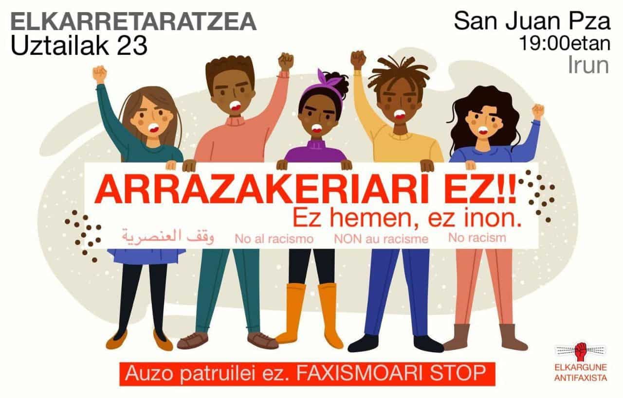 Este miércoles a las 19 horas se celebrará una concentración en la plaza San Juan de Irun con el lema “No al racismo. Ni aquí ni en ningún lugar. No a las patrullas ciudadanas. No al fascismo”. La convocatoria ha sido impulsada por colectivos sociales, vecinales y sindicales de Irun y Donostia en respuesta al «creciente discurso de odio detectado en los últimos meses en la ciudad fronteriza».