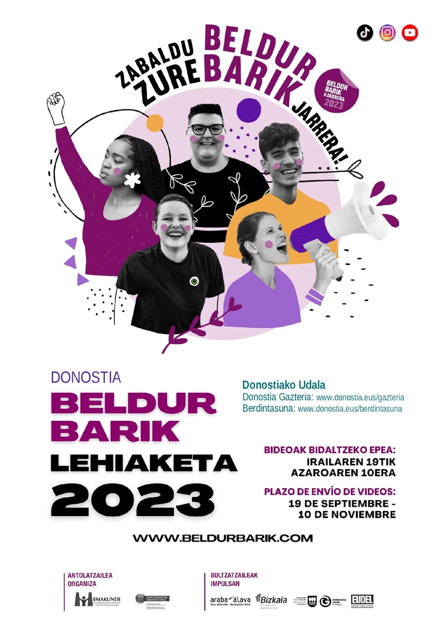 El Ayuntamiento donostiarra invita a jóvenes de entre 12 y 20 años a presentar proyectos artísticos para dejar constancia de las múltiples manifestaciones de la violencia sexista y machista existentes en la sociedad. El plazo para recibir trabajos está abierto hasta el 10 de noviembre en la web www.beldurbarik.eus. El concurso está organizado por Donostia Gazteria e Igualdad del Ayuntamiento de Donostia.