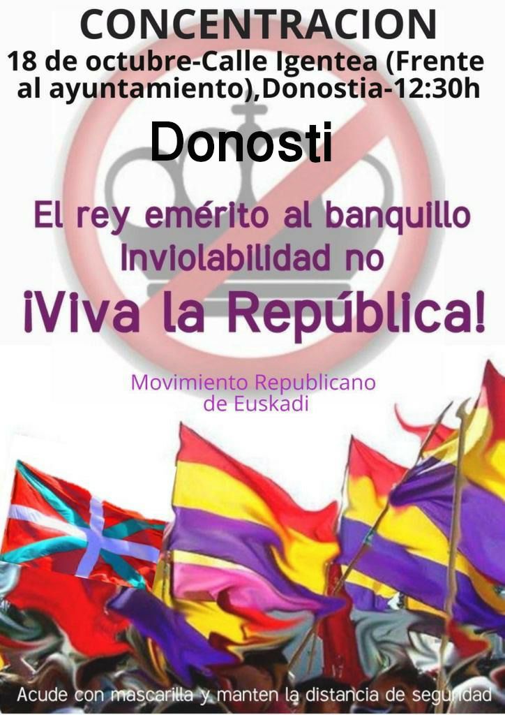 El Movimiento Republicano de Euskadi ha convocado para mañana concentraciones en distintos puntos de la geografía vasca en contra de la monarquía. En Donostia será en la calle Igentea a las 12.30 horas.
