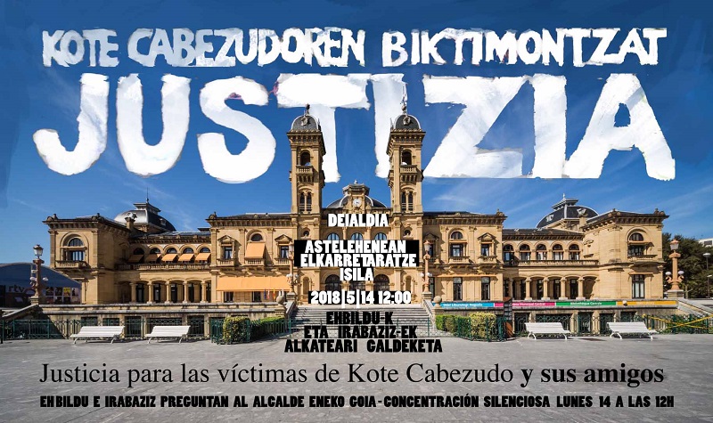 La plataforma ‘Kote Cabezudoren Biktimontzat Justizia’ ha convocado para el lunes una concentración silenciosa «en apoyo a las víctimas de Kote Cabezudo» en la puerta trasera del Ayuntamiento (calle Ijentea) a las 12 horas. La concentracion se ha convocado para la misma mañana en que tanto EH Bildu como Irabazi van a preguntar en comisión al grupo municipal gobernante por sus actuaciones en atención a las presuntas víctimas del fotógrafo.