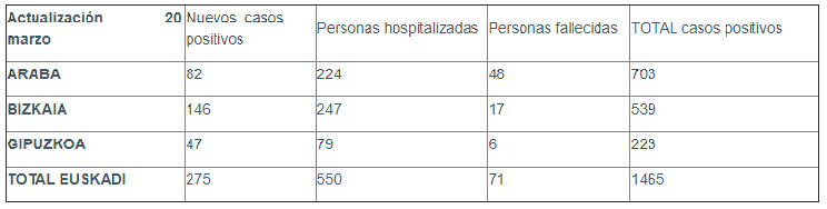 Son 18 personas las que han fallecido en Euskadi en las últimas horas por coronavirus y en total son 71 hasta ahora en los tres territorios. Además en las últimas horas se han producido 275 contagios hasta alcanzar un total de 1.465 con 550 pacientes ingresados. En Gipuzkoa son 223 los casos hasta el momento.