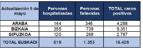 El número de casos confirmados de coronavirus desde el comienzo de la pandemia en Euskadi asciende a 16.426, aunque casi el 75% de los pacientes ya está curado. En Gipuzkoa son 268 fallecidos (uno más que ayer), 120 hospitalizados y son 2.787 positivos desde que comenzó la crisis (nueve más que ayer).