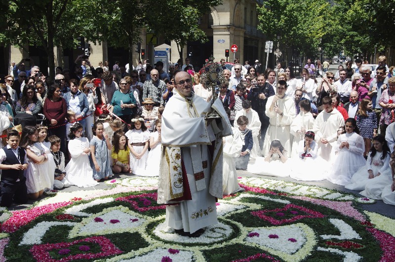 Con motivo de la festividad del Corpus Christi el Obispo José Ignacio Munilla ha celebrado la misa del mediodía en el Buen Pastor y a continuación ha participado en la procesión. En la procesión han participado todos los niños que han hecho este año la Primera Comunión. Antes de la Eucaristía padres y niños de catequesis y catequistas han elaborado una alfombra de flores, hecha con pétalos, en la explanada de la catedral del Buen Pastor.