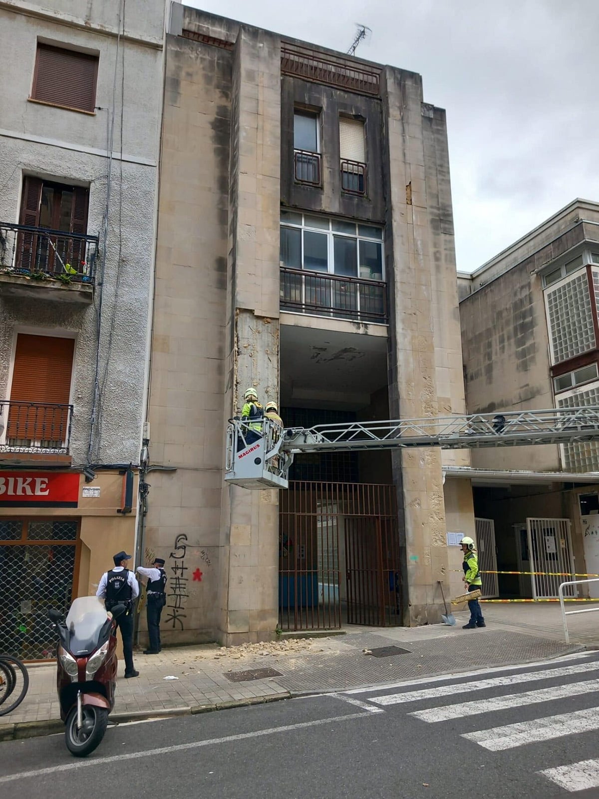 El desprendimiento de unos cascotes de la fachada del edificio de la ikastola Jakintza, por causas que se desconocen, ha obligado a las fuerzas de seguridad a intervenir en la zona, procediendo al cierre del paso de vehículos y a la retirada de otros elementos de la propia fachada que pudieran ocasionar mayores desperfectos.