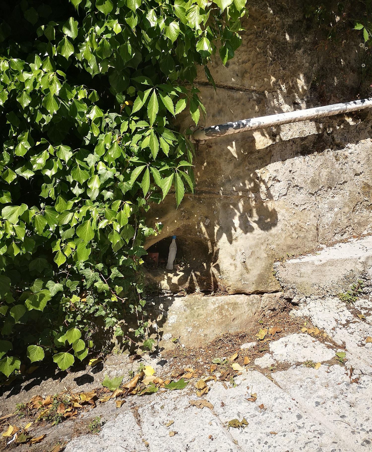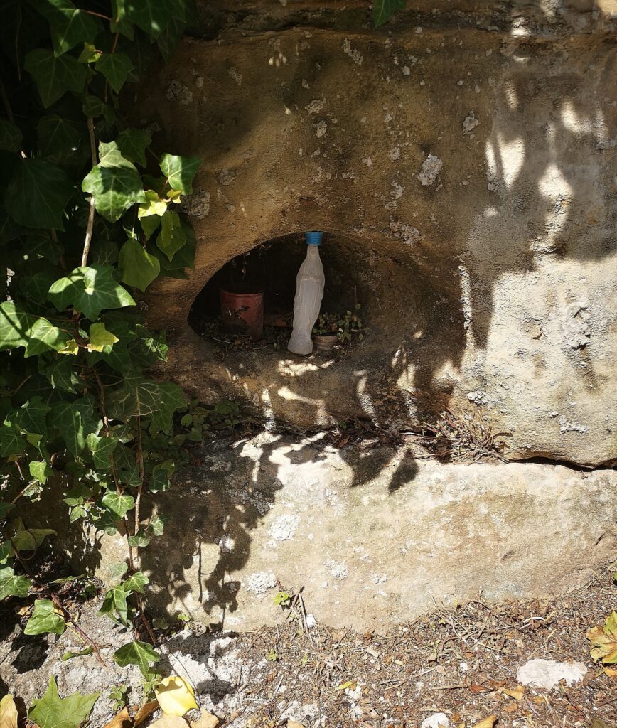 La versión actual de la virgen no es la misma que la que había al principio, bastante más robusta y de un material más consistente. De color blanco, la de ahora es una de esas botellas de plástico de agua bendita en forma de estatua que medirá alrededor de 15 centímetros. A su lado, le acompaña una vela roja muy desgastada por el tiempo, además de tierra y hierbajos. Fuertemente pegada a la superficie, dista mucho de la imagen celestial que se le ha otorgado a su figura.