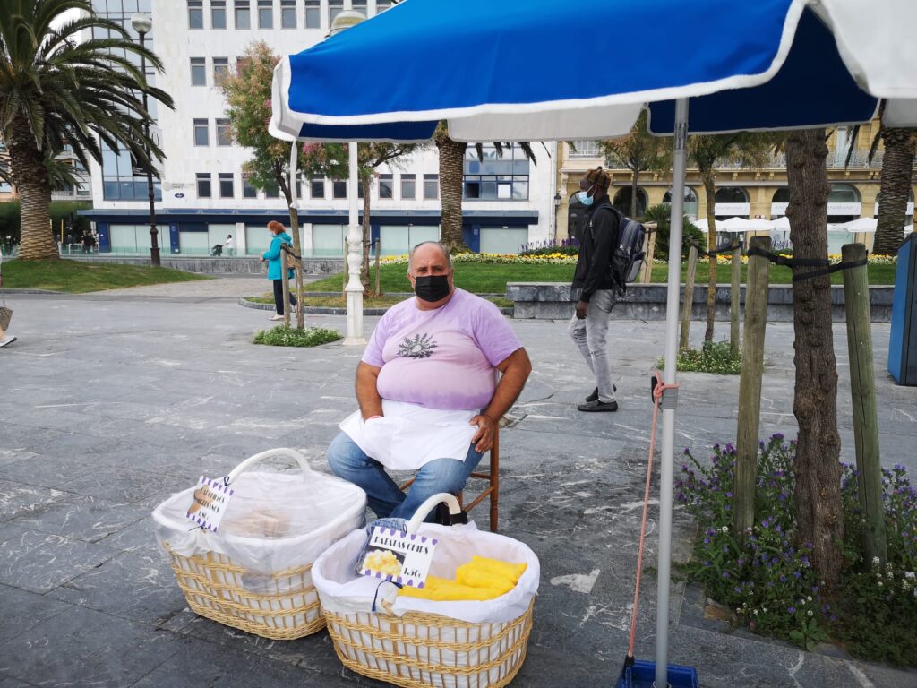 Jesús Etxegoien, el incombustible barquillero de La Concha, en cambio, está que trina con un tiempo que invita a la melancolía más que a la típica alegría despreocupada del verano. “Fíjate cómo está el cielo. Esto es pésimo. Parece noviembre. La playa no se llena”, dice sentado con los dos cestos de patatas y barquillos tapándole los pies.
