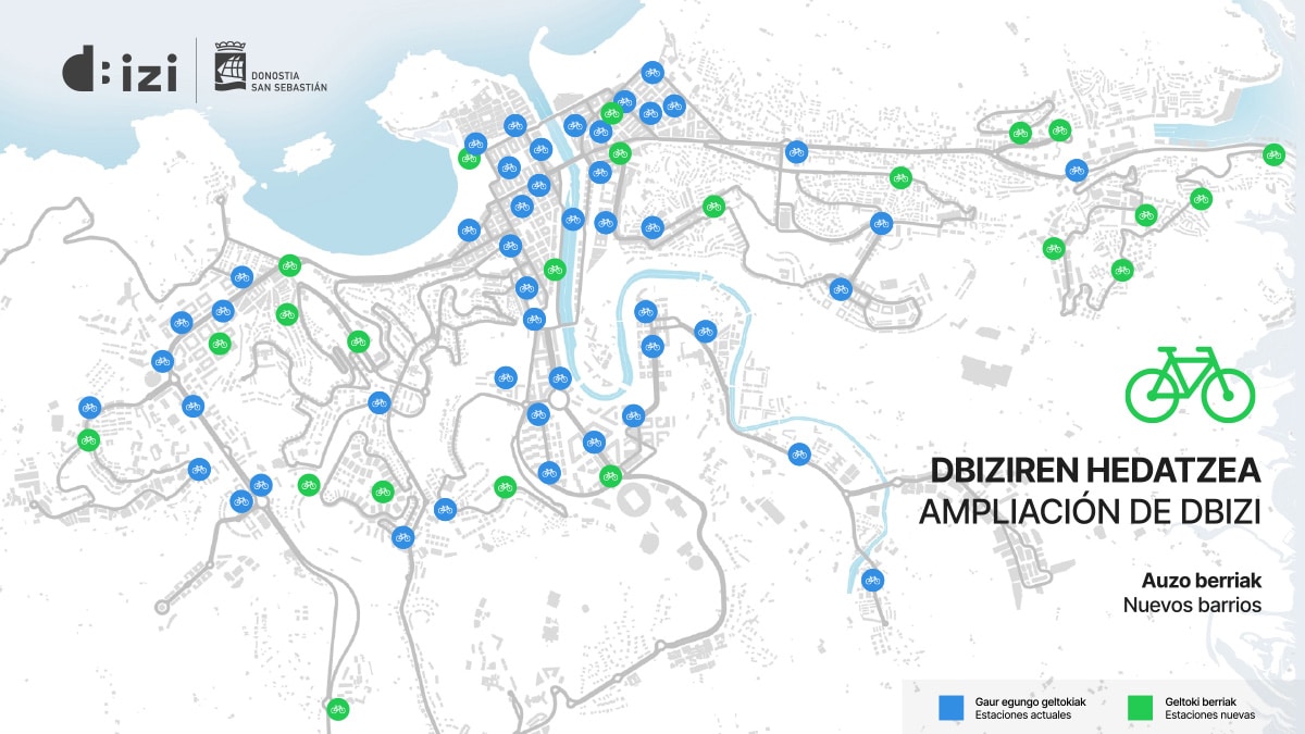 El sistema de alquiler de bicicleta de San Sebastián, Dbizi, tendrá a partir de finales de julio 23 nuevas estaciones mixtas y 257 nuevas bicicletas eléctricas en la flota (añadidas a las 120 bicicletas eléctricas actuales). Esta ampliación del servicio extenderá el sistema a zonas como Altza, Bidebieta o Añorga. Allá donde no llega todavía la red de bidegorris las bicis circularán por la calzada tal y como han explicado los responsables en la presentación.