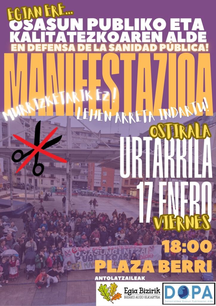 Estas protestas culminarán en la manifestación unitaria convocada para el 17 de enero con el lema ‘Desde Egia también en defensa de una sanidad pública y de calidad. No a los recortes. refuerza de la atención primaria» que saldrá de la Plaza Iruresoro y concluirá en la Plaza Martín Santos.