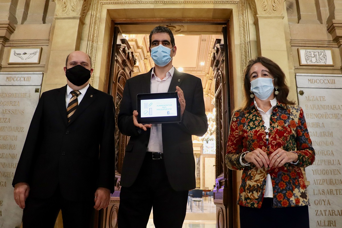 Responsables del gobierno municipal de Donostia han presentado esta mañana el borrador del proyecto de presupuesto para este año. «Las cuentas para 2021 tienen como objetivo continuar dando pasos firmes para afrontar de manera decidida la situación que atravesamos”, ha dicho el alcalde Eneko Goia, acompañado por el concejal de Hacienda y Finanzas, Jaime Dominguez-Macaya, y la concejala de Promoción Económica y Ecología, Marisol Garmendia. El presupuesto será aprobado mañana en la Junta de Gobierno Local, y posteriormente, presentado al detalle en la Comisión de Hacienda. Según el calendario previsto la aprobación inicial puede darse en el pleno extraordinario del 31 de marzo.