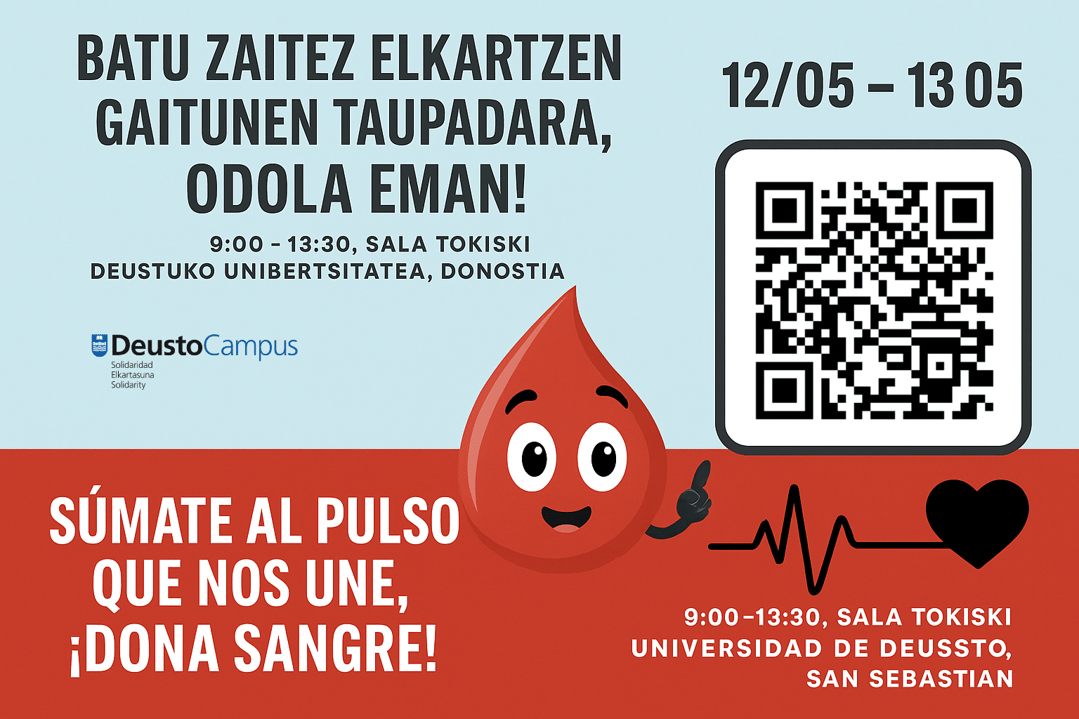 Deustuko Unibertsitateko Enpresen Administrazio eta Zuzendaritzako graduko laugarren mailako ikasle talde batek odola emateko kanpaina antolatu du, borondatez, «Batu zaitez elkartzen gaituen pultsuari, odola eman!» lelopean, Gipuzkoako Odol Emaileen Elkartearekin lankidetzan. Donostiako campuseko Tokiski aretoan eman ahal izango da odola, maiatzaren 12an eta 13an, 09:00etatik 13:30era. Helburua ez da behin odola ematea, baizik eta herritarrak eta, bereziki, unibertsitateko elkartea aldiro-aldiro odola ematearen garrantziaren inguruan sentsibilizatzea.