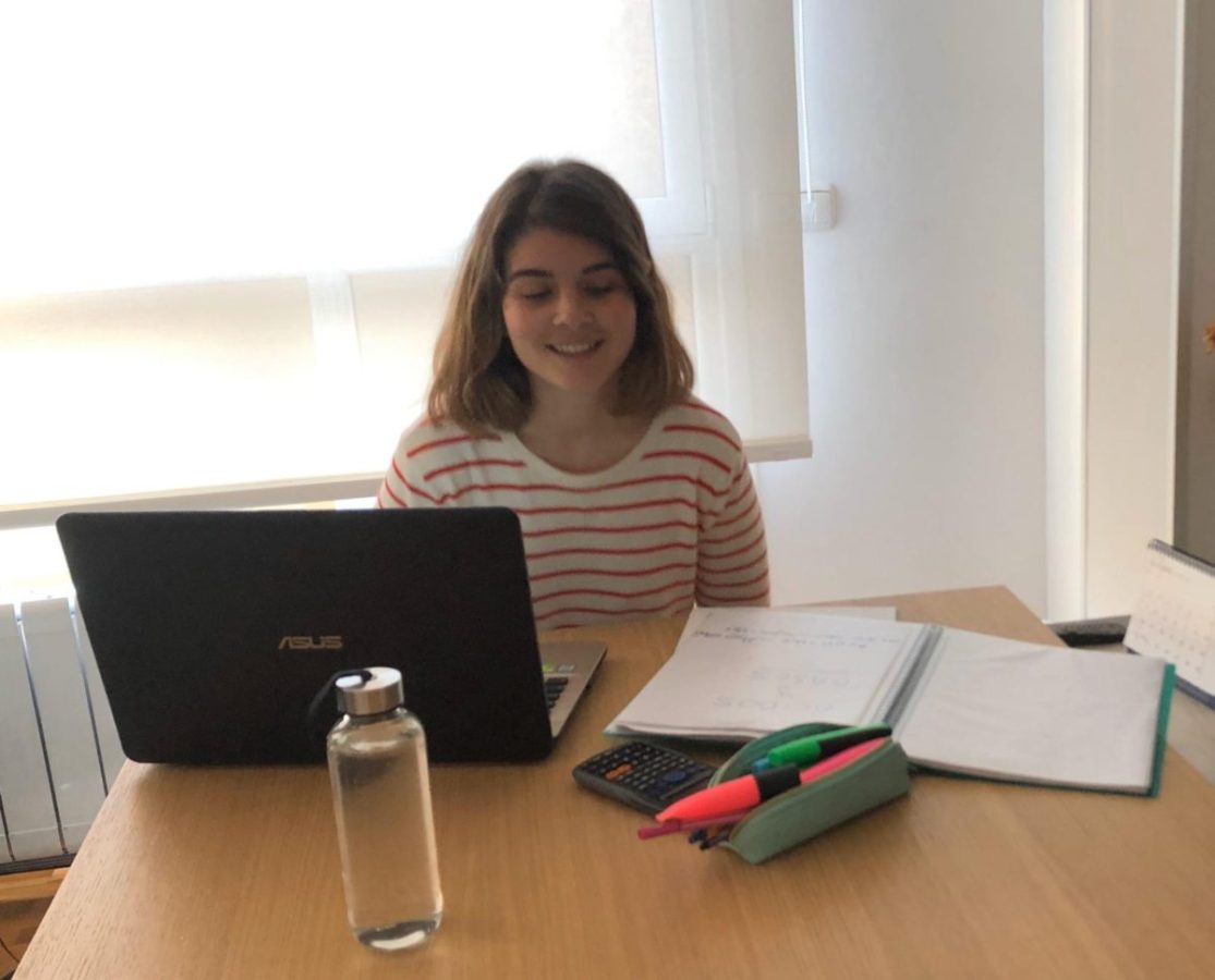 Por la mañana sigo las clases online por vídeo llamada y por la tarde sigo estudiando. Es un poco agobiante porque no es lo mismo que ir a clase presencial, tiene más dificultades. Pero hay que hacer el esfuerzo para terminar el curso bien. También intento hacer deporte todos los días con Youtube. Además hago vídeo llamadas a mis amigas e incluso una de ellas, que es psicóloga, nos esta dando clases de relajación que son geniales. La verdad es que no tengo tiempo para aburrirme.