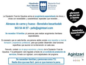 «Abrazos de carne y hueso» es el lema con el que la Diputación Foral de Gipuzkoa anima a la población a participar en el programa de acogimiento especializado. Actualmente son necesarias 10 familias para acoger a chavales de hasta 18 años que tienen necesidades especiales, algún grado de discapacidad, problemas conducta…
