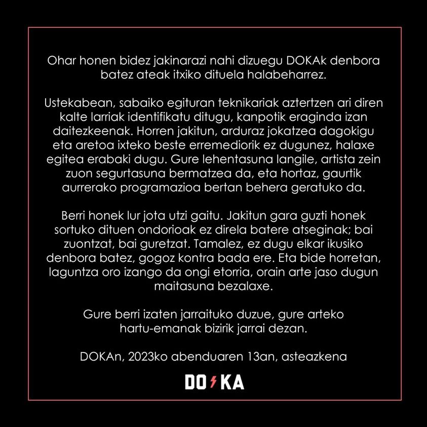 Piden paciencia y durante los próximos días se pondrán en contacto con quienes tengan adquiridas entradas para próximas actuaciones. Y también irán informando sobre la situación. Más información: «Hemos cubierto un hueco en el ocio de Donostia»