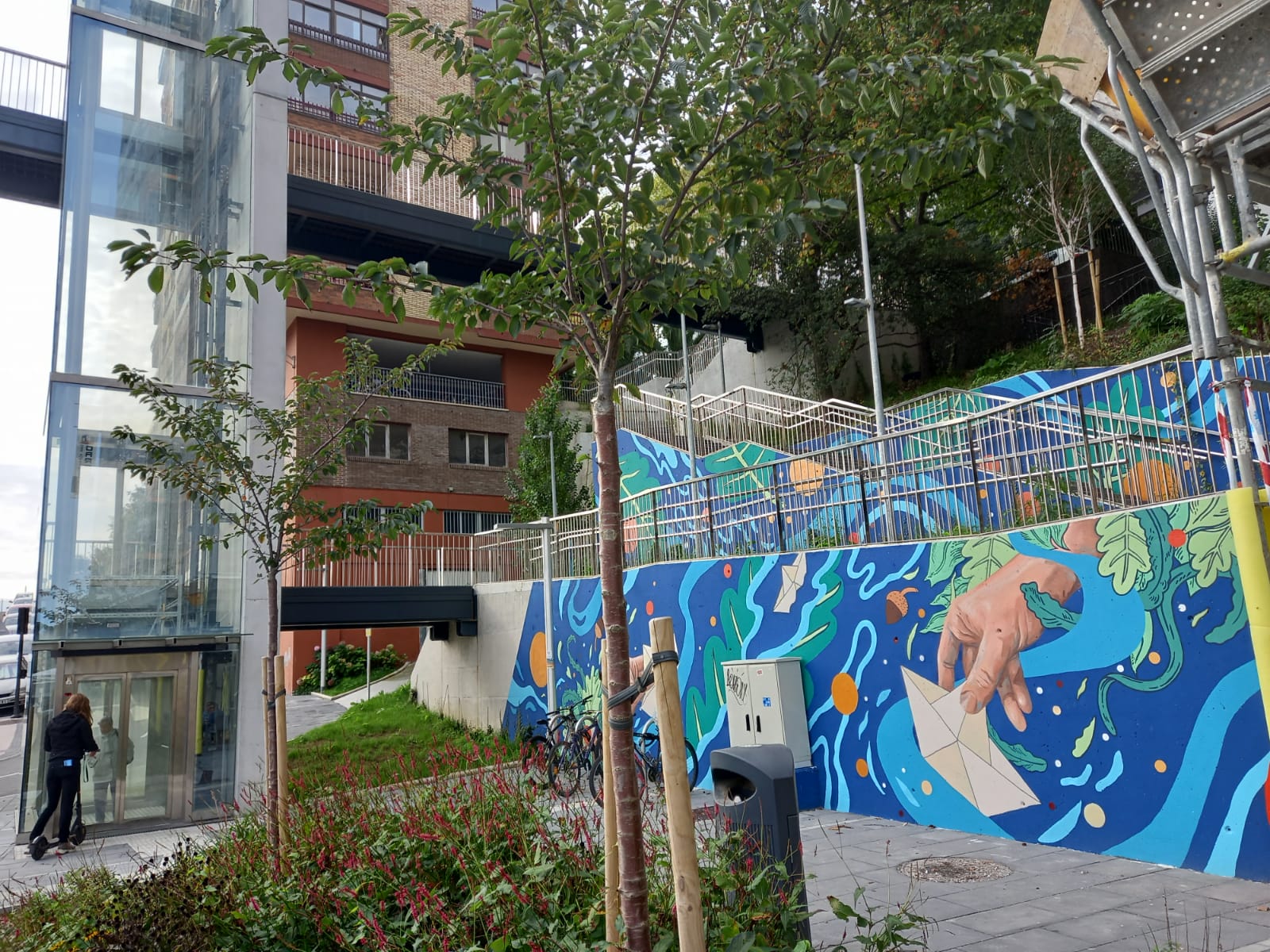 No es la única obra que Udane Juaristi ‘Udatxo’ ha elaborado para esta nueva edición de Donostia Apain. En Loiola tiene otro mural terminado desde antes del pasado verano. ‘La de las zapatillas’, dicen los vecinos cuando pasan por la calle Urbia. Y es que las zatillas, su movimiento y las sombras protagonizan la colorida obra.