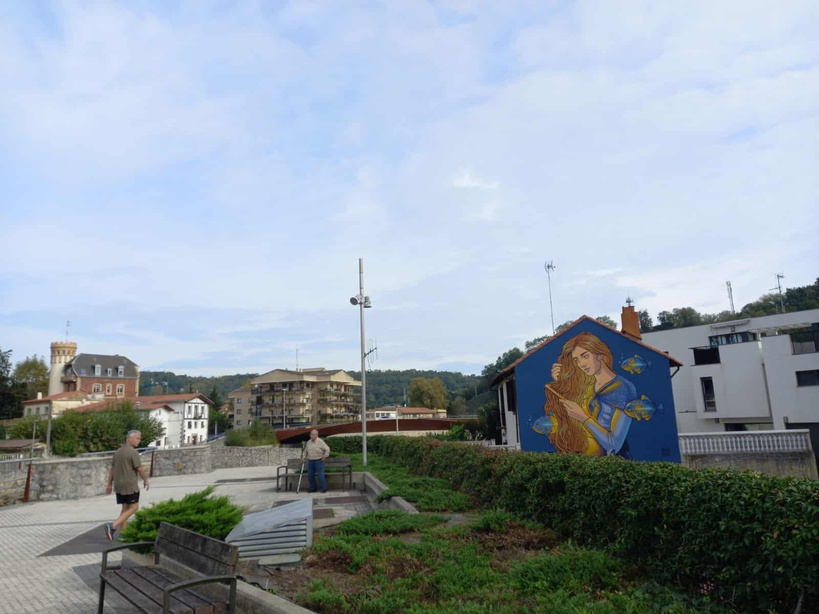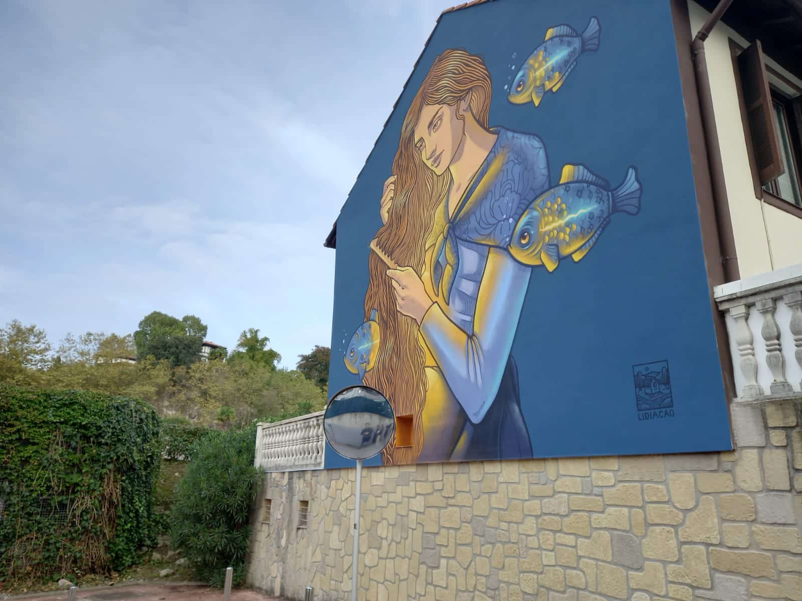 La gallega Lidia Cao se ha encargado de embellecer una fachada del Paseo de Martutene jugando con Erreka Mari, personaje mitológico que por supuesto se peina la larga melena con su peine de oro.