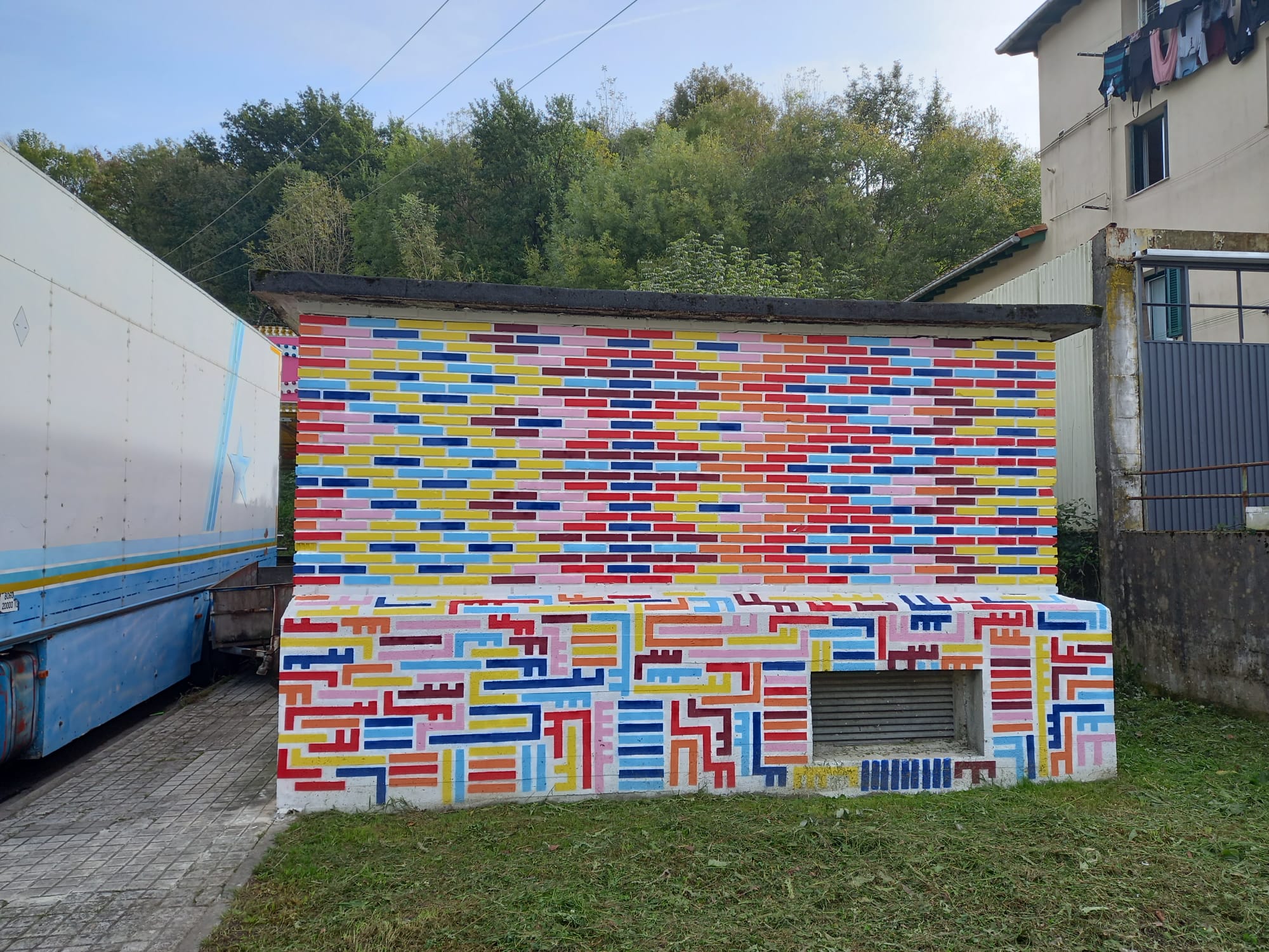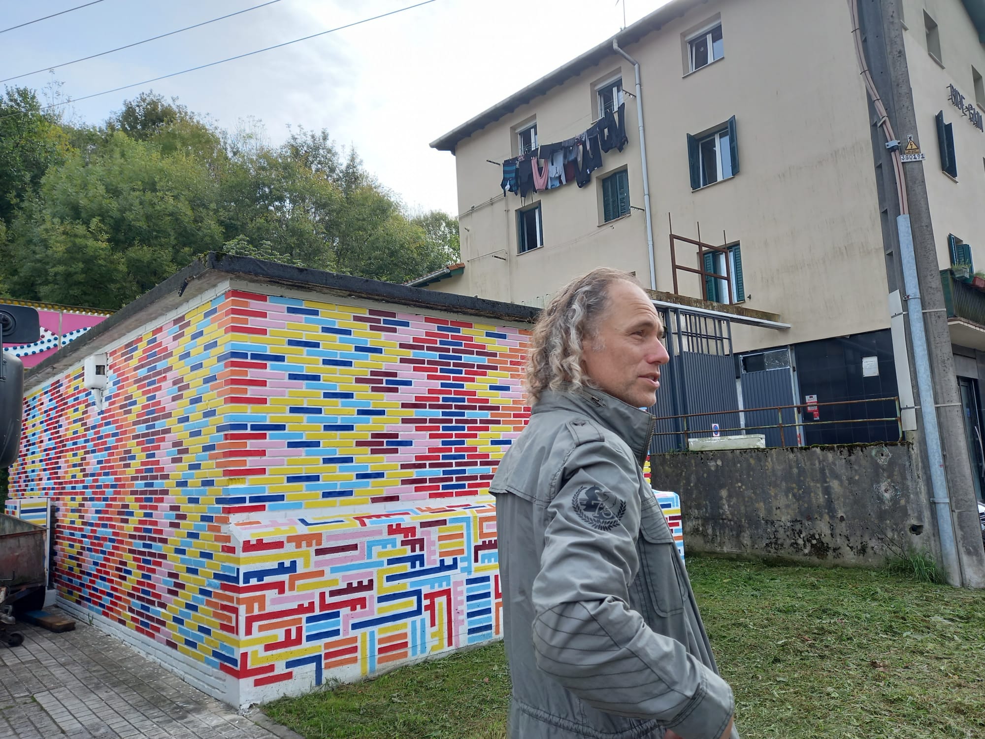 El artista inglés Stephen Webb ha disfrutado mucho de su experiencia en la rotonda del barrio, concretamente dando color al nódulo de conexiones eléctricas construido en ladrillo. Su diseño fue «al dictado de los ladrillos» tal y como ha contado él mismo esta mañana viendo el resultado, que ha gustado mucho a los vecinos, además, varios de los cuales se acercaban a hablar con el artista mientras trabajaba y a llevarle alguna que otra cerveza.
