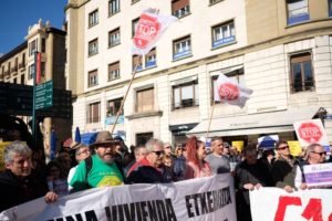 La situación de más de 300 hogares en posesión, ahora, del fondo buitre Azora y las previsibles consecuencias han convulsionado esta semana a los donostiarras más que cualquier aviso de desahucio hasta ahora. Y es que entre la situación de Benta Berri con el fondo buitre Blackstone y esta última incursión se abre un futuro incierto para quienes viven de alquiler. Por eso han sido muchos los que se han reunido hoy frente a la sede de la Inmobiliaria Vascongada, comprada por el fondo buitre Azora. En la calle Ijentea no sólo estaban los afectados de las calles Zabaleta, Gran Vía, calle Salud… Los donostiarras han respondido a la convocatoria y con ellos había representantes de asociaciones de vecinos y de partidos políticos municipales como Elkarrekin Donostia y EH Bildu.
