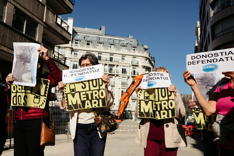La plataforma Donostia Defendatuz ha pedido a las autoridades «un estudio hidráulico y geotécnico riguroso elaborado por entidades de prestigio internacional sobre las repercusiones de las obras del metro en el subsuelo del Ensanche Cortázar» y que se paralicen cautelarmente las obras ya iniciadas en el centro urbano «para evitar más afecciones a las estructuras de los edificios». En un encuentro con la prensa hoy en la calle Easo, en pleno epicentro de las obras del metro, la plataforma ha insistido en que las grietas de Zubieta 1 sí aparecieron a raíz de las obras («la denuncia del 6 de noviembre sigue su curso») y han denunciado también vibraciones en los edificios de la zona.