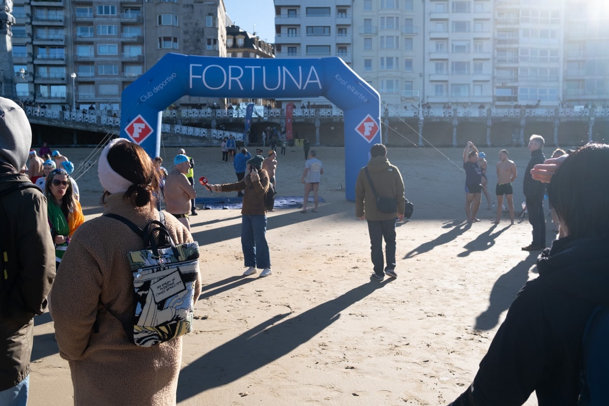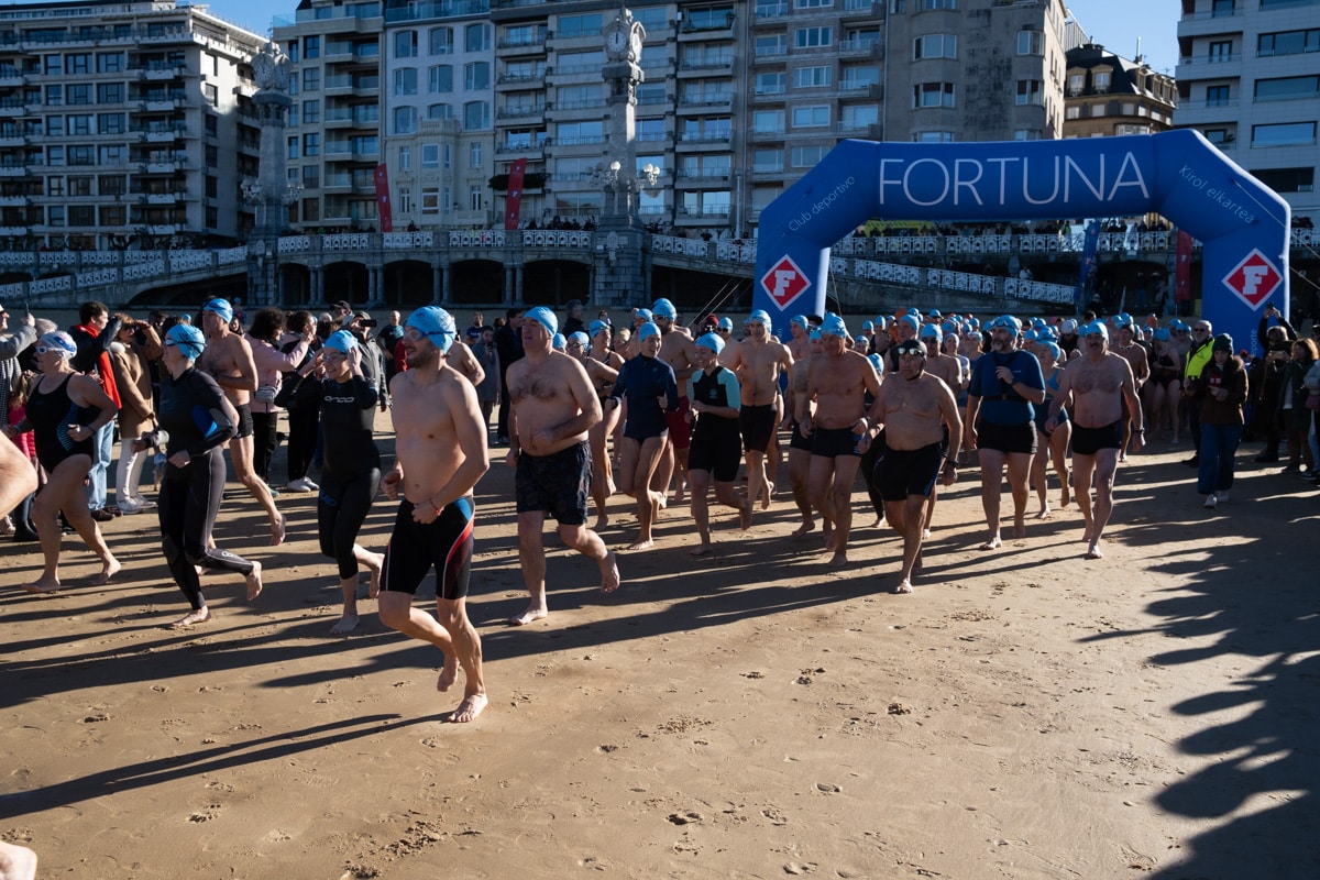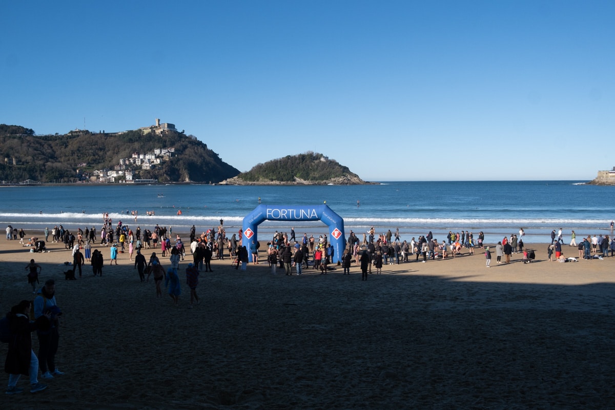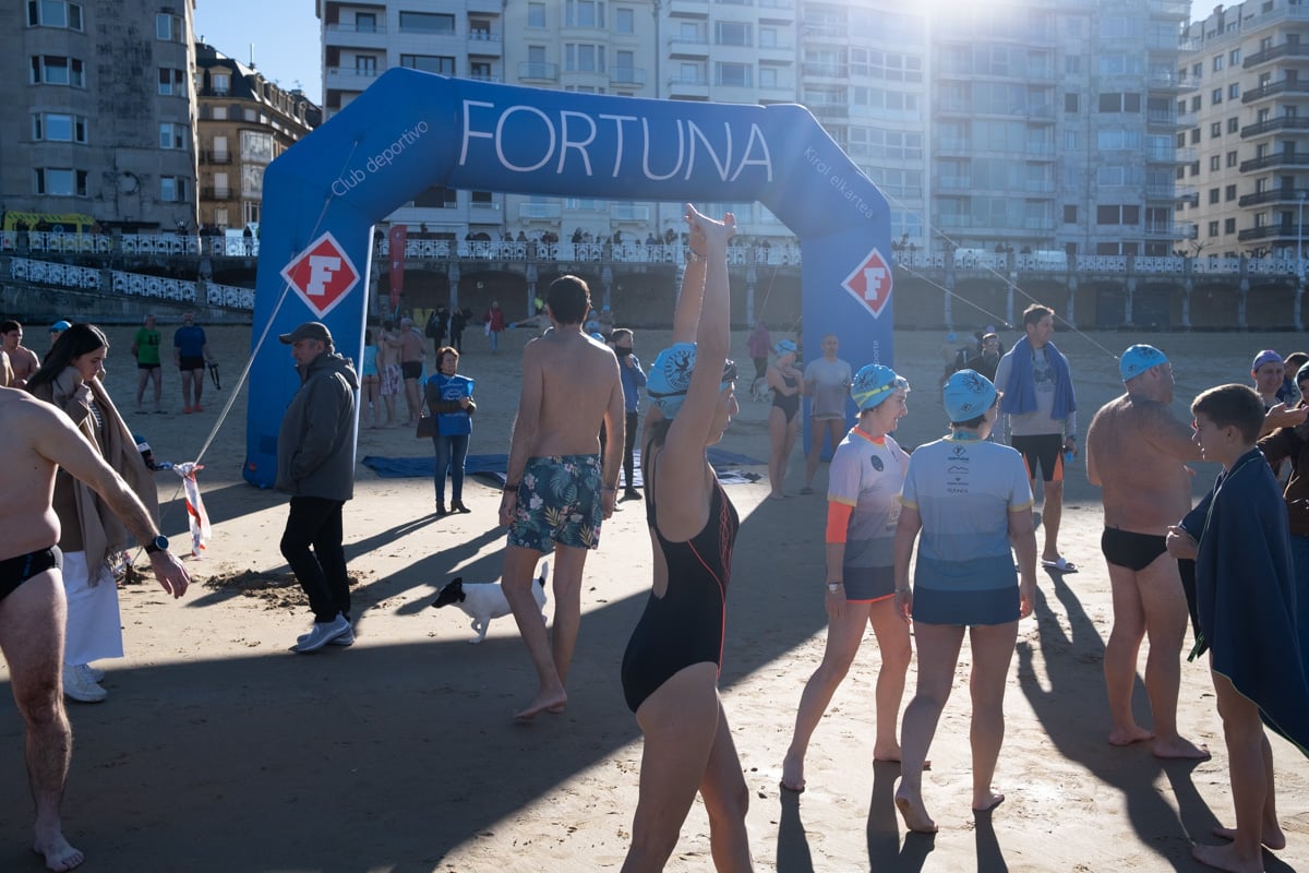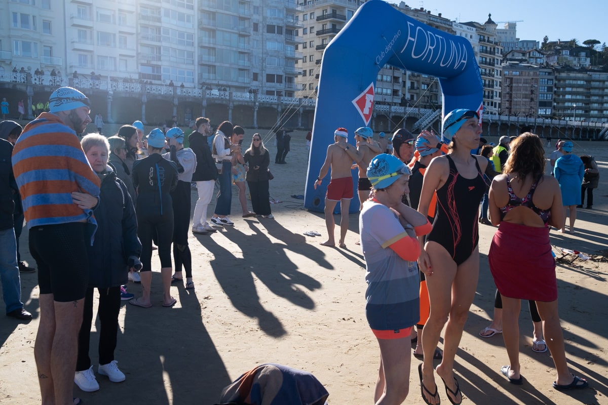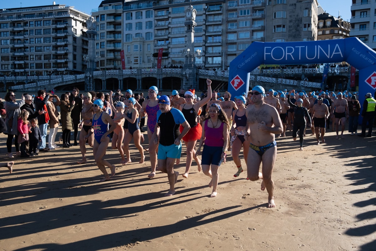 Bañistas valientes frente al frío han participado este mediodía en el Kontxapuzón, la cita ya tradicional del Día de Navidad organizada por el C.D. Fortuna que este año destinará los fondos obtenidos al Banco de Alimentos de Gipuzkoa. Con las ganas de sol que tiene Donostia y el buen humor de las fiestas el éxito estaba asegurado. Todos los nadadores, unos 200, han salidos felices del agua.