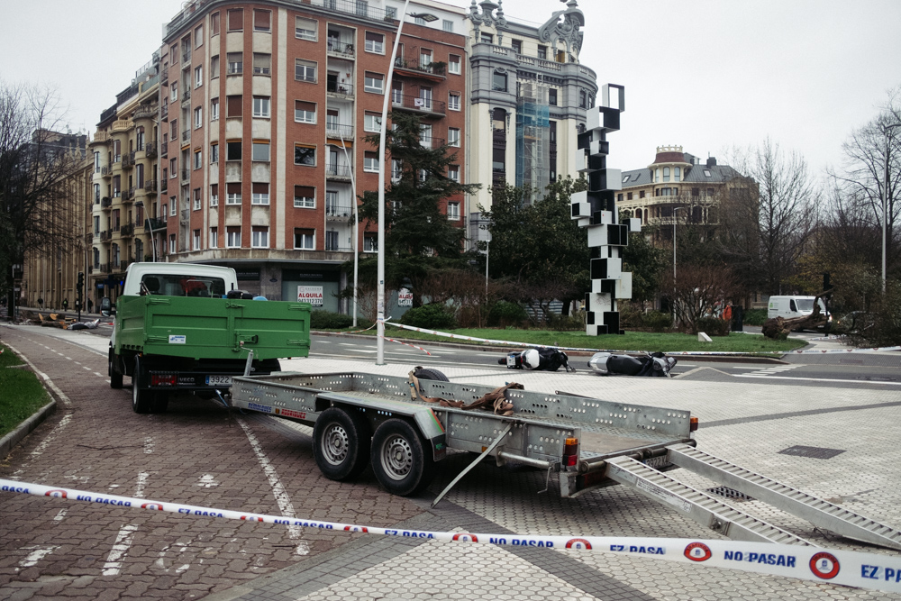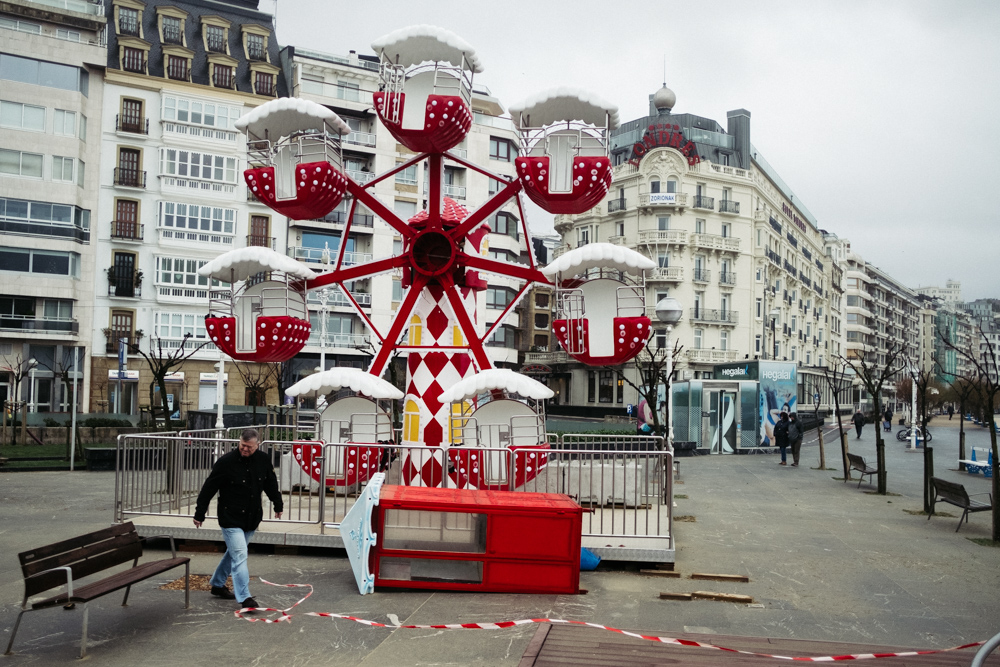 Entre esas imágenes destacan el vídeo que se ha hecho viral de un hombre empujado violentamente por el viento contra una furgoneta en la esquina del Hotel de Londres (la víctima evoluciona favorablemente en el hospital), la cubierta arrancada de la piscina del Club de Tenis, la noria sin cabinas superiores (no porque hubieran volado, como temieron los transeúntes, sino porque habían sido retiradas por precaución), la mesa en Ribera de Loiola colgando de un árbol… y tantas otras.