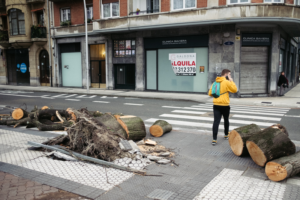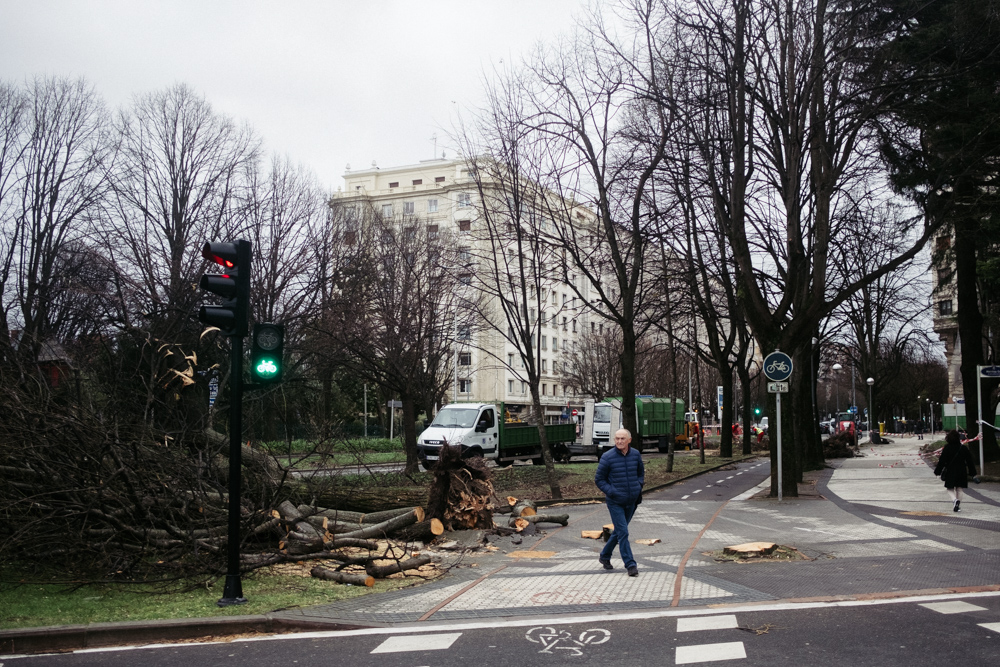 En todo caso fueron los cortes de tráfico lo más aparatoso del día en las inmediaciones de Sancho el Sabio y la plaza Easo a causa de la caída de un árbol primero y el posterior análisis de los otros ejemplares después. El atasco fue absoluto.