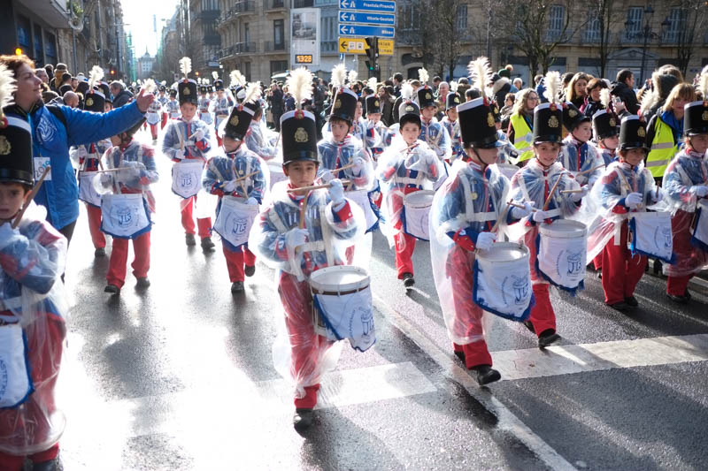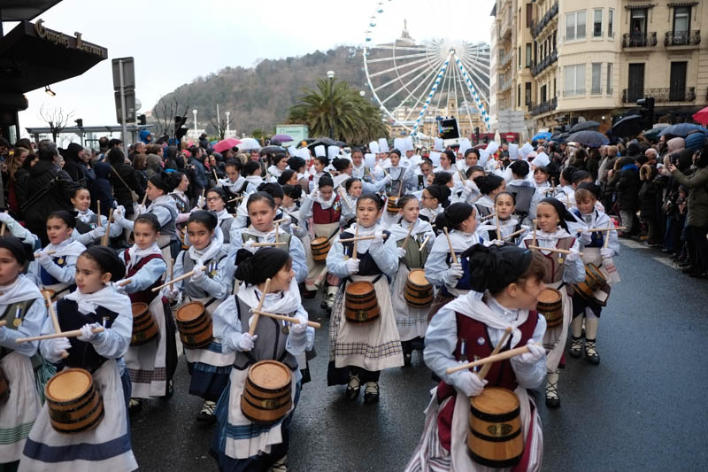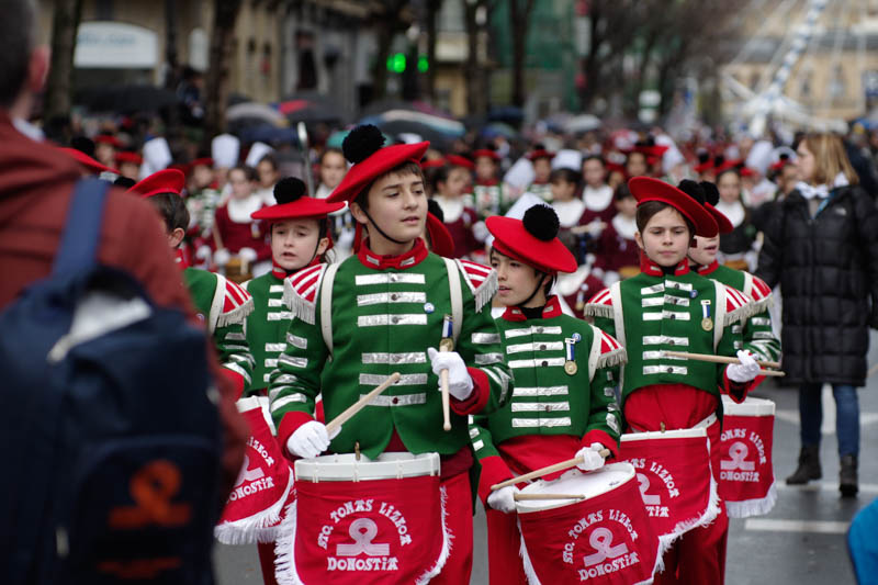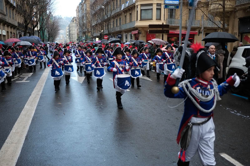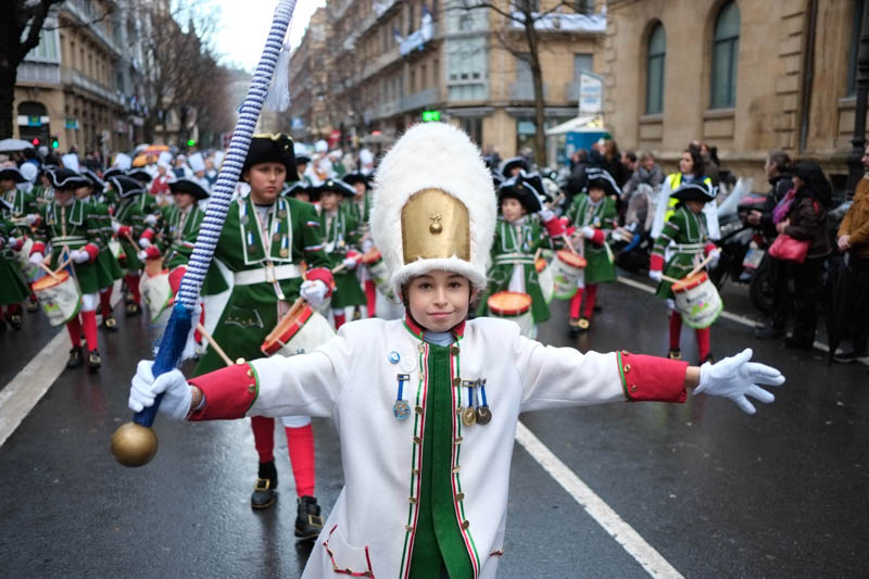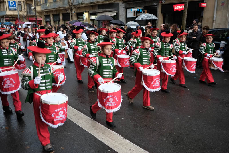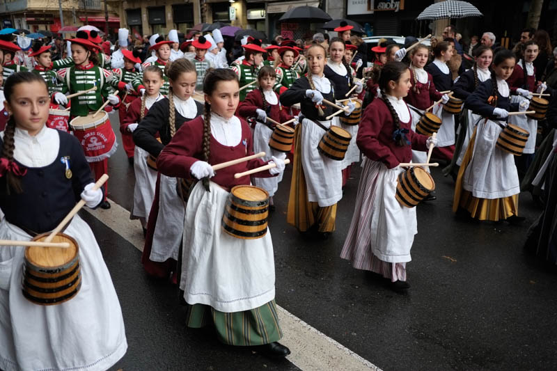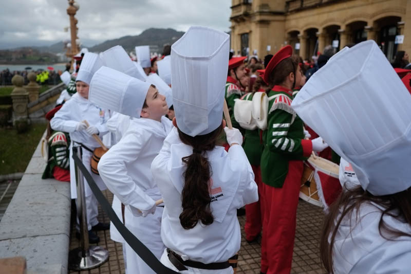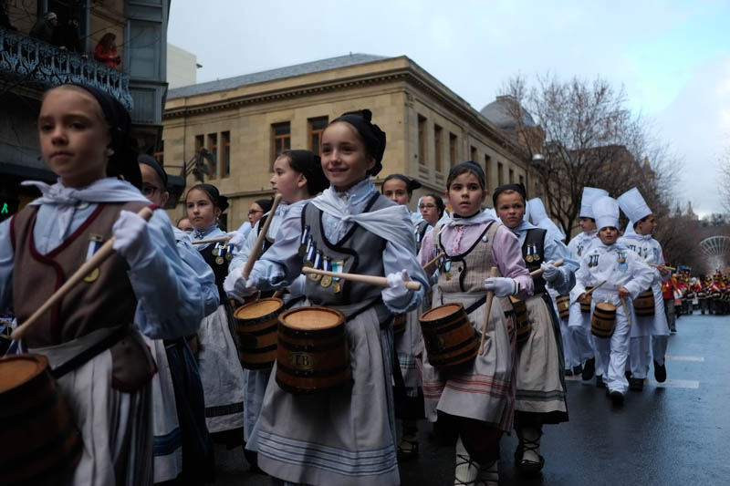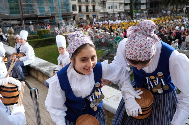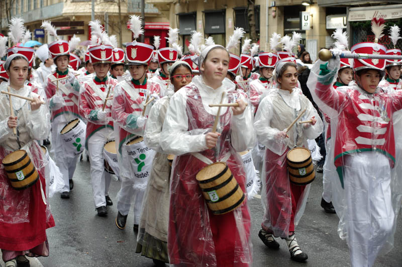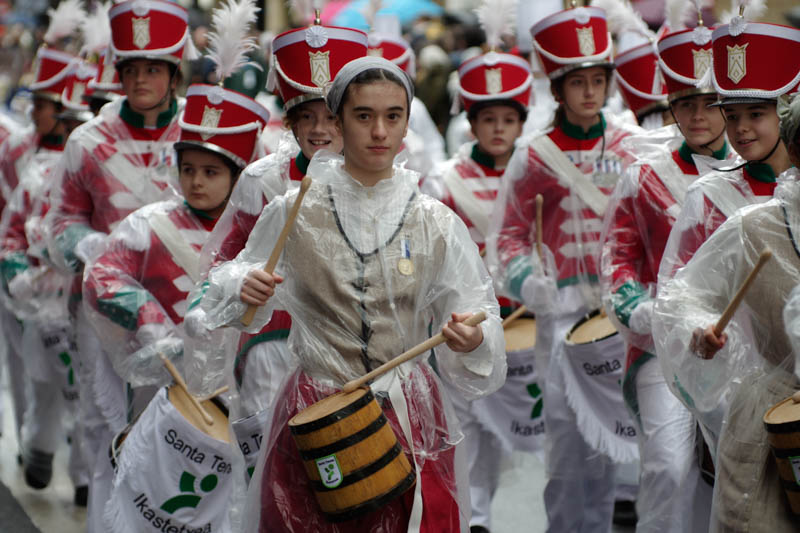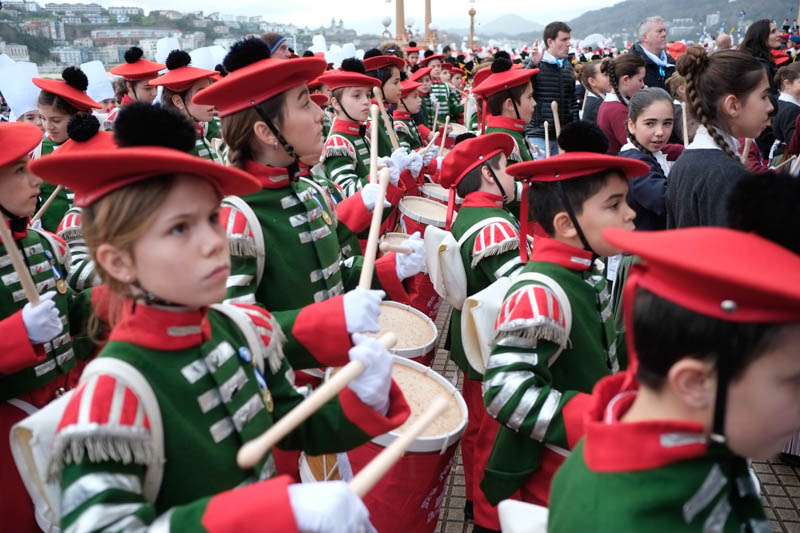 Contentos pueden estar los 5.088 jóvenes tamborreros que hoy han desfilado por San Sebastián porque funcionó el conjuro y con todas las familias donostiarras mirando al cielo la lluvia quedó en poca cosa. Y es que precisamente al comenzar la Marcha de San Sebastián a las 12 horas sí se puso oscuro el ambiente y cayó agua, pero no la suficiente como para arruinar un día que muchos no van a olvidar.