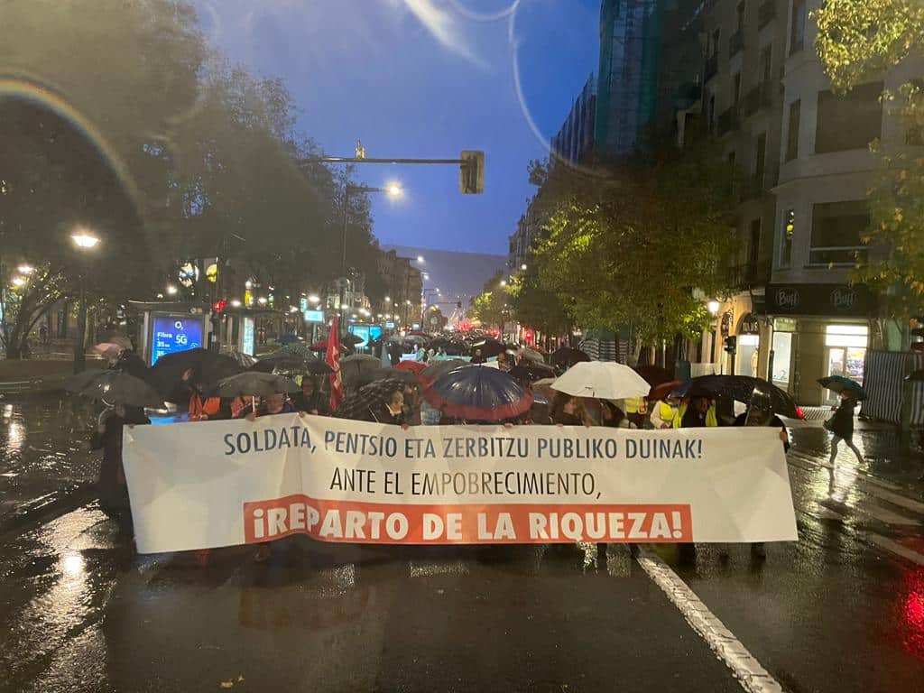 En San Sebastián cientos de personas han desafiado a la lluvia y han recorrido las principales calles de la ciudad para protestar por el «encarecimiento de la vida» y reclamar la recuperación del poder adquisitivo de las pensiones y los salarios, y una mejora de los servicios públicos.