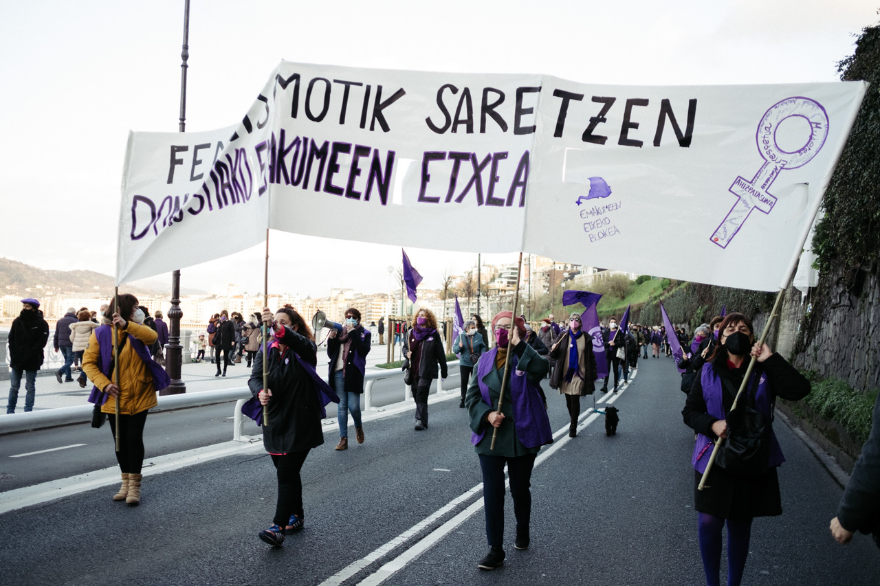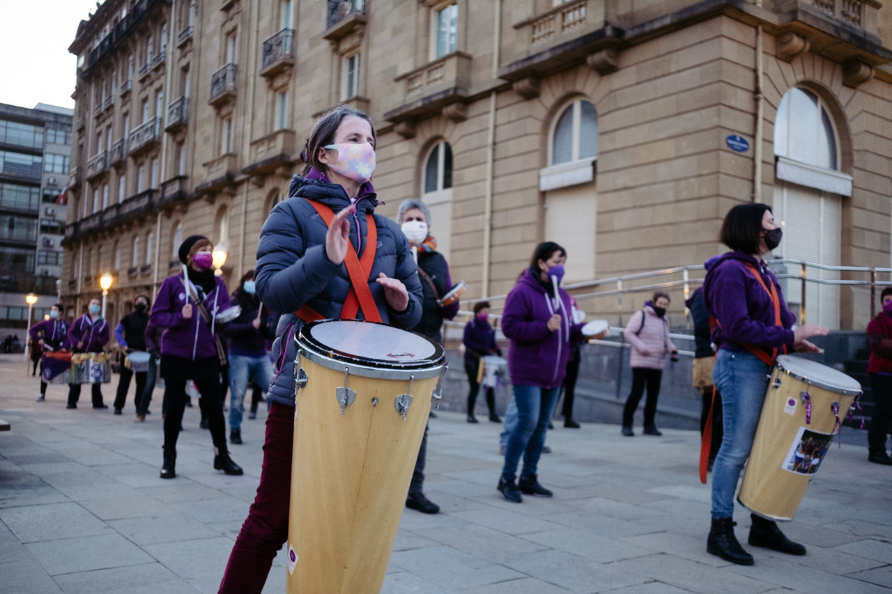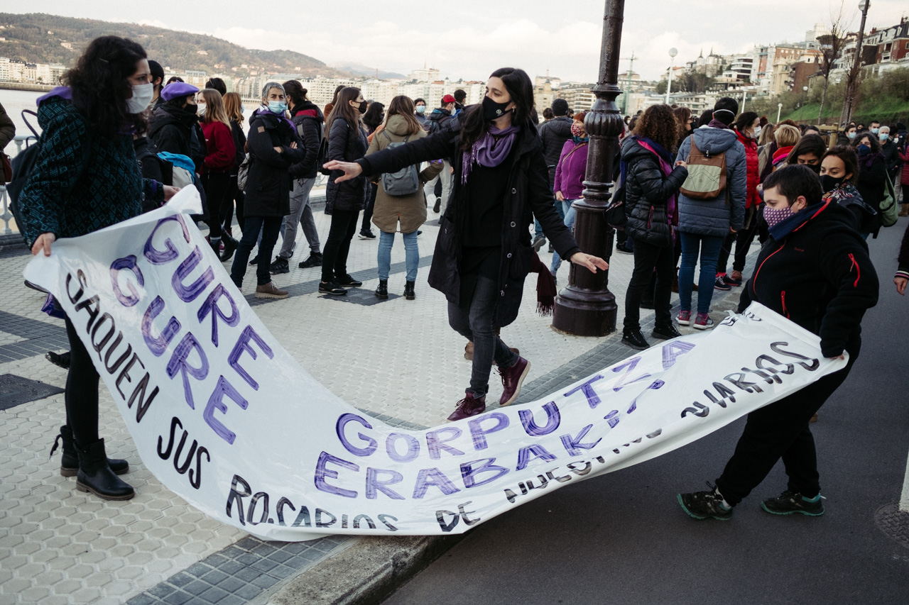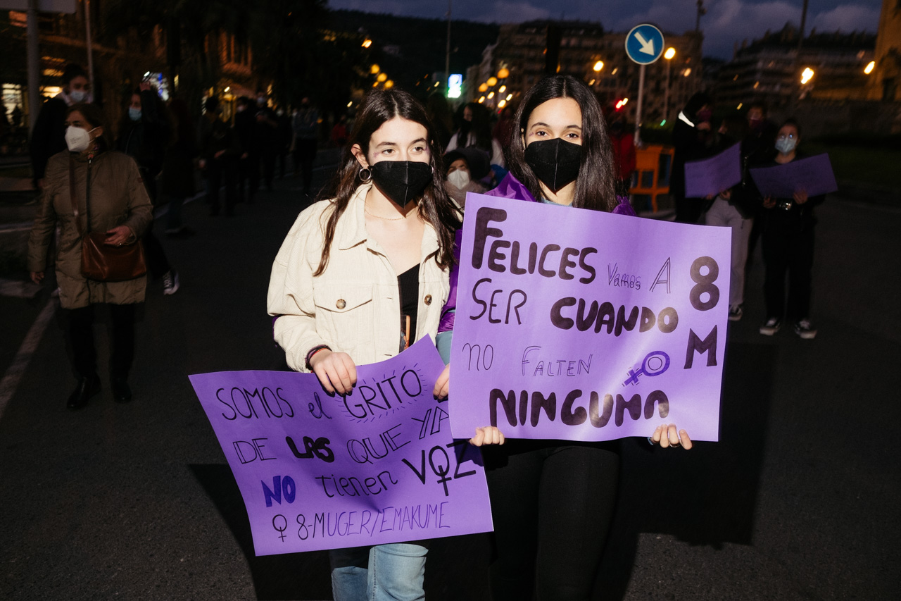 De forma muy ordenada y más silenciosa que otros años pese al ritmo de la batucada, que también ha tenido sus momentos, ha transcurrido la nutrida manifestación de mujeres, pero también de hombres, que ha protagonizado la tarde donostiarra del 8M igual que ha ocurrido en tantas otras ciudades vascas.