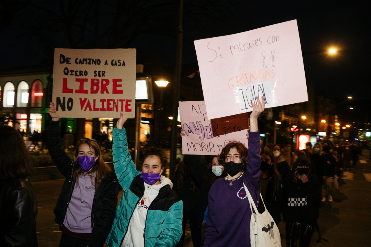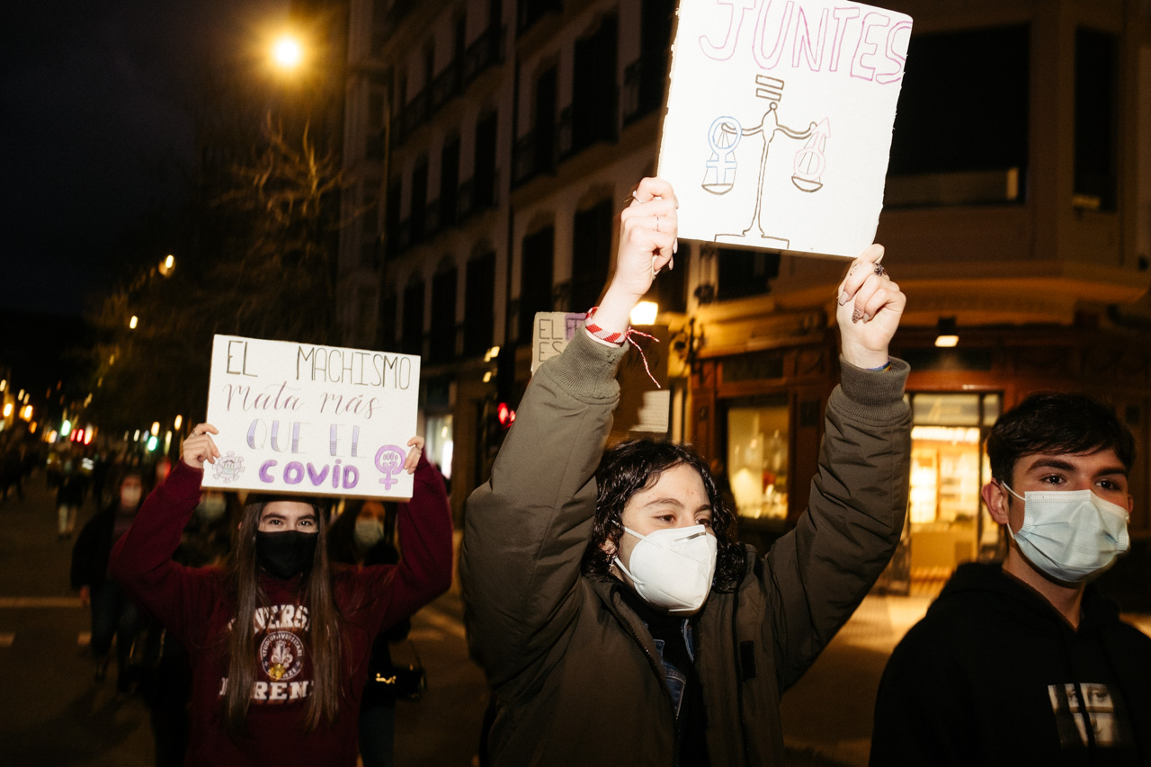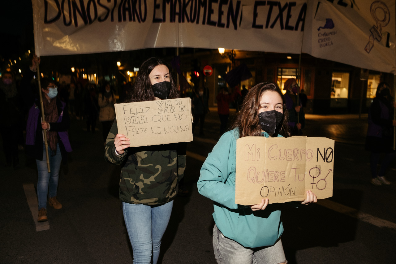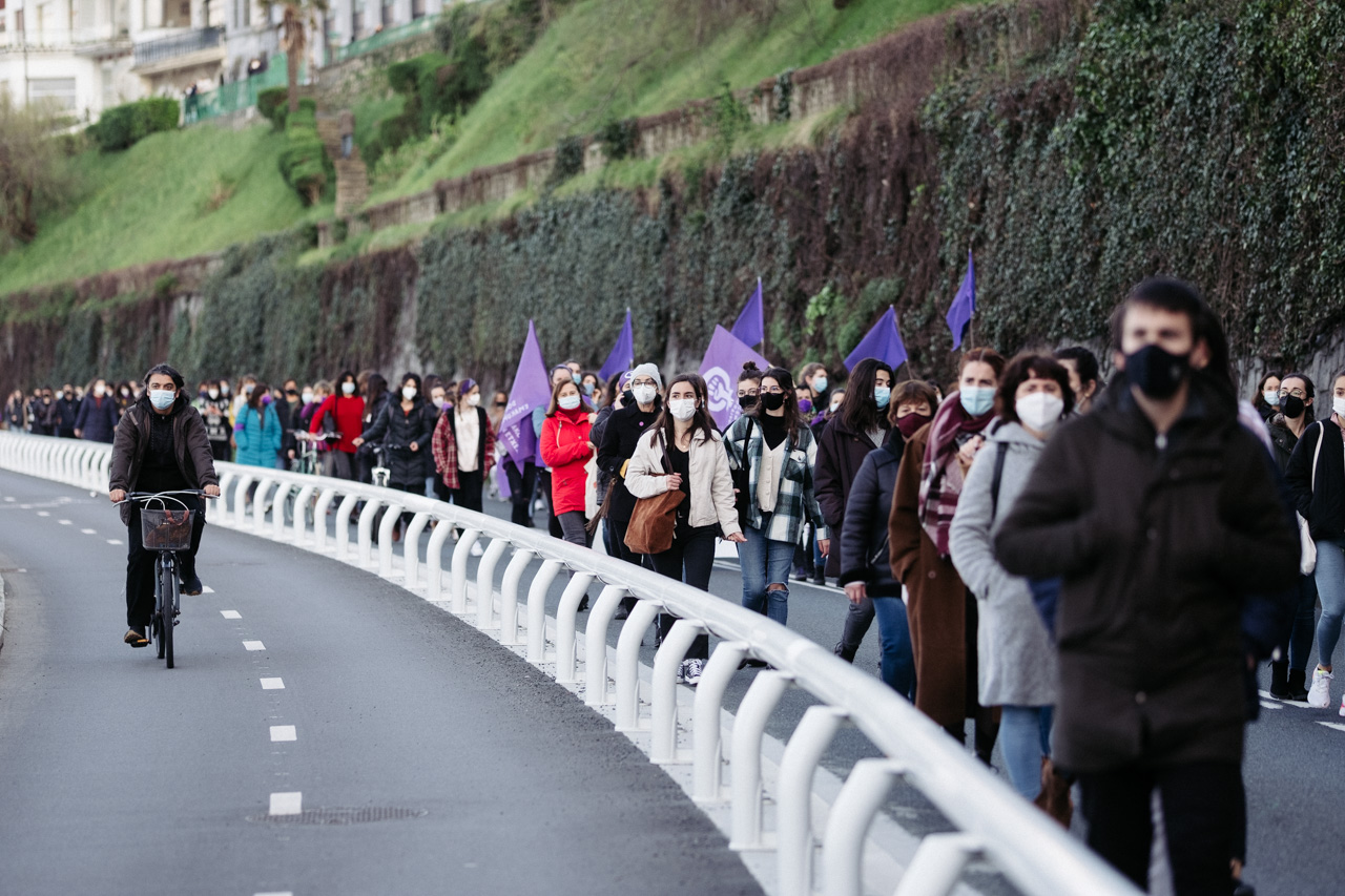 Con la salida en el túnel del Antiguo y lemas bien conocidos, esta marcha, convocada por el Movimiento Feminista de Euskal Herria, ha respetado al milímetro las distancias y ha mantenido el tono de sus reivindicaciones igualitarias, aunque tal y como se ha apuntado el tono ha sido menos alegre que años anteriores.