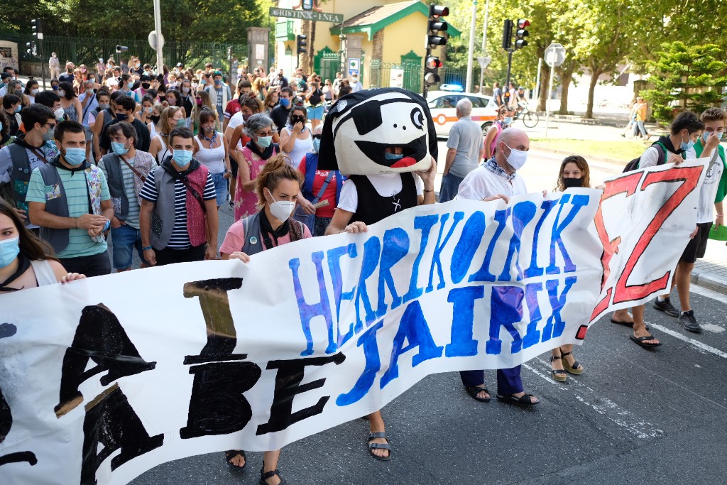 Donostiako Piratak se han manifestado este mediodía junto a otras comisiones de fiestas de barrios «para reivindicar y defender» las fiestas populares que según han expresado les han arrebatado a causa de la pandemia. La cita ha partido del parque Gladys Enea de Egia (Cristina Enea) en dirección al Kursaal y al Puerto.