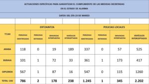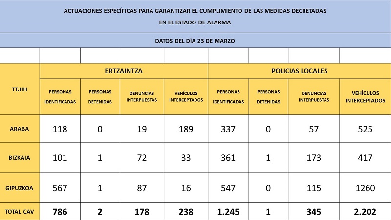 Por otro lado entre la Ertzaintza y las Policías Locales ayer, lunes, e incoaron 523 nuevas actas o denuncias por infracción de la Ley de Seguridad Ciudadana en la CAPV, por incumplimiento de las medidas decretadas con motivo del actual Estado de Alarma por el coronavirus. La Ertzaintza sancionó ayer a 178 personas, mientras que las Policías Locales denunciaron a 345. Asimismo 3 personas fueron detenidas en relación al mismo motivo.