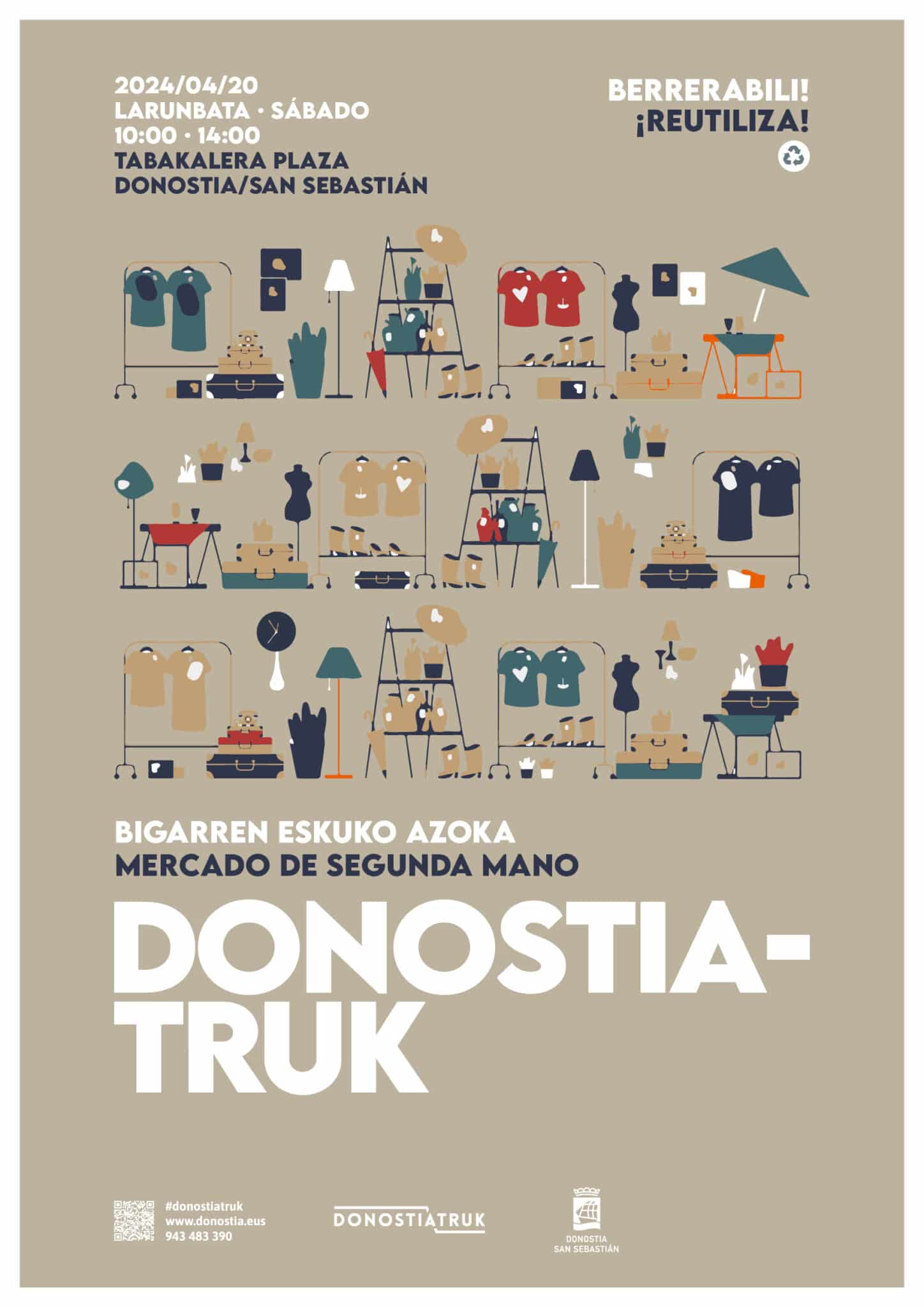 Este sábado 20 de abril en la plaza interior de Tabakalera se celebrará de 10:00 a 14:00 el mercadillo mensual de segunda mano Donostiatruk que organiza la Dirección de Salud y Medio Ambiente del Ayuntamiento.