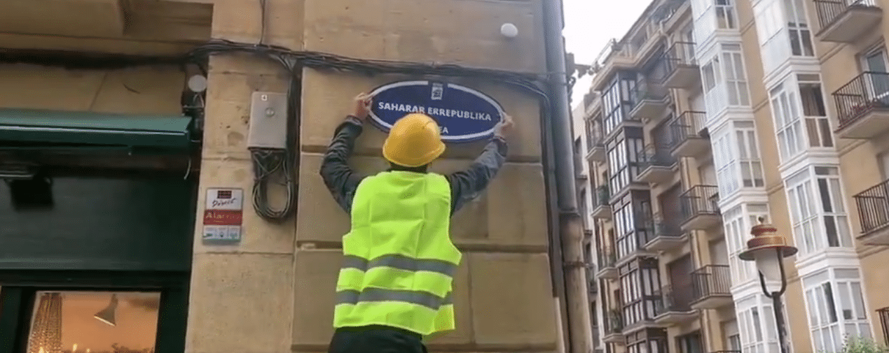El colectivo Ehun convirtió en las últimas horas la calle Alfonso XIII en calle República del Sáhara en una acción pacífica protagonizada por dos activistas disfrazados de operarios y ayudados con una escalera. El vídeo que refleja su acción, a plena luz del día, está en twitter. El pasado diciembre el mismo movimiento ‘tapó’ las entradas a las obras del Metro de Donostia.