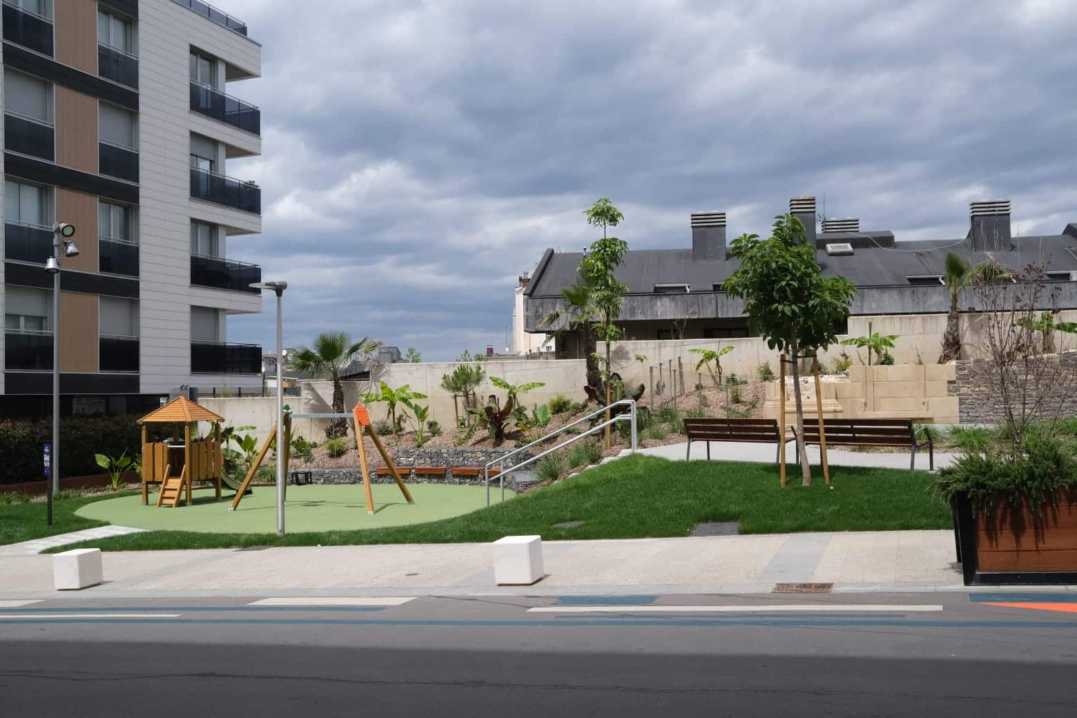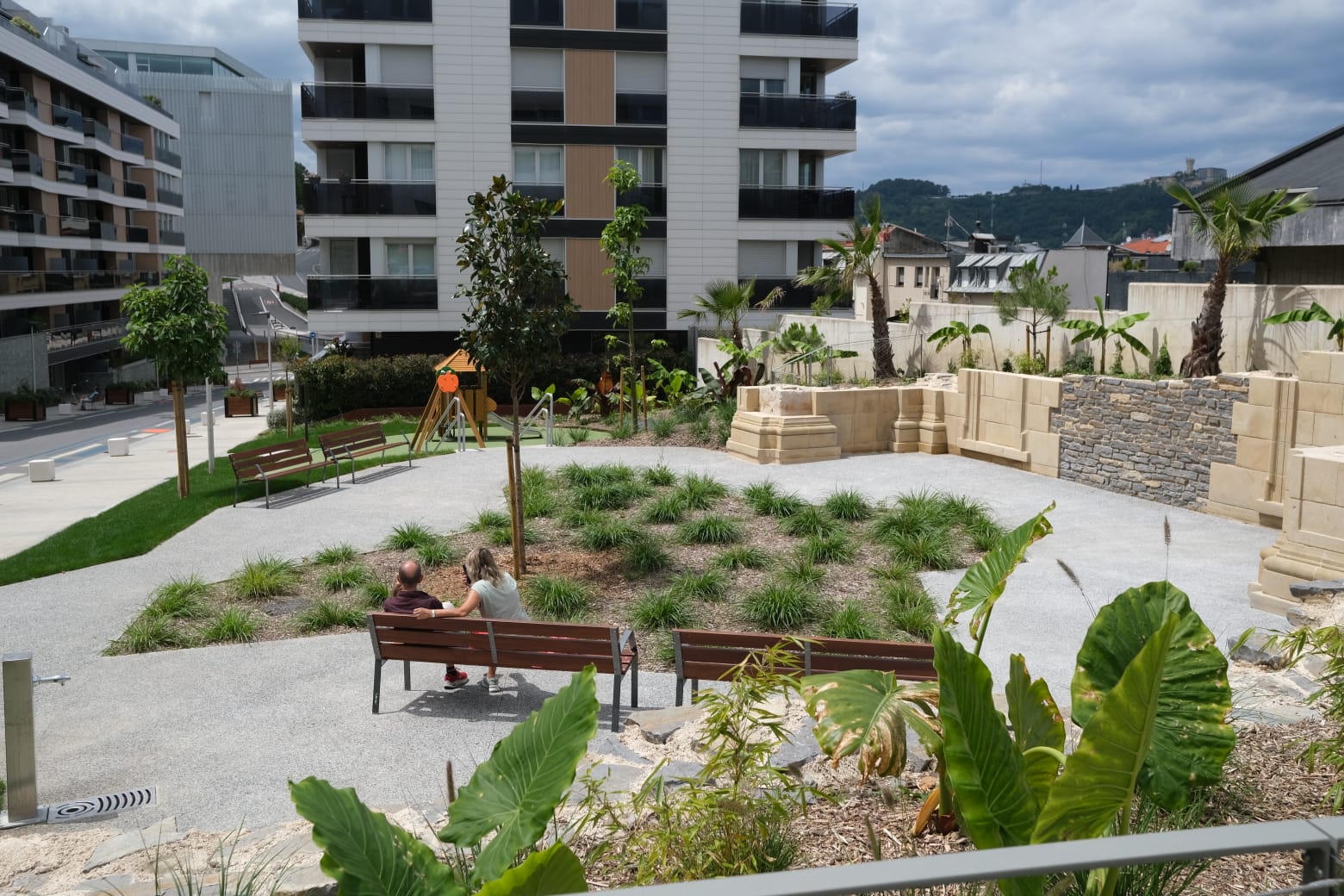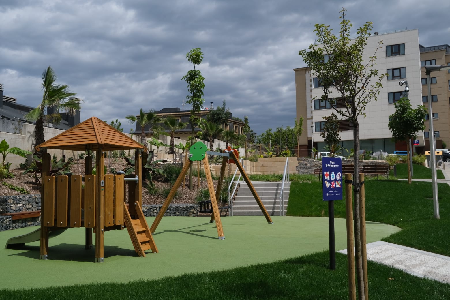 La calle Alto de San Bartolomé cuenta con una nueva zona de estancia. Los trabajos para acondicionar la parcela situada entre el Hotel Catalonia Donosti y el edificio de viviendas correspondiente a los portales 1-3-5-7 han finalizado, una vez asentado el césped que la rodea.