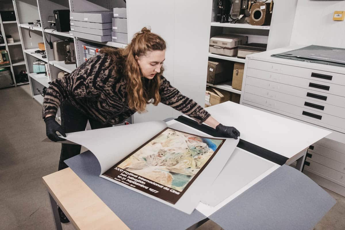 Entre los carteles que hoy se han mostrado destaca el que Iván Zulueta diseñó para la edición de 1978. Un año antes, el autor fue el pintor Ruiz Balerdi. Son pequeñas joyas que, como tantas otras piezas del archivo, abren caminos, como ha explicado Irati Crespo. Caminos al pasado, sí, pero también al presente y a la memoria viva de un festival que no deja de contarse a sí mismo.