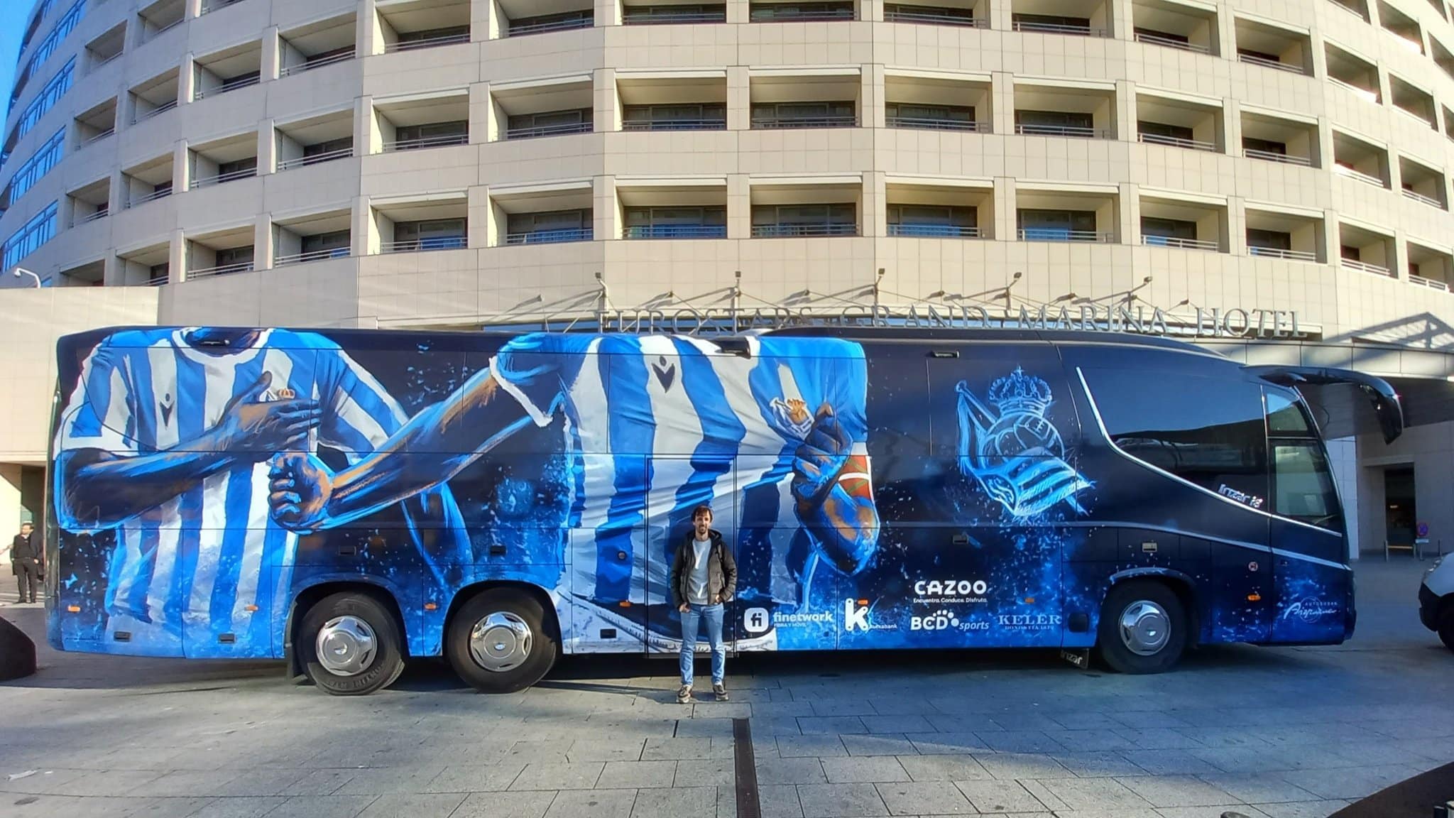 (Sergi Escudero/EFE). El bus de la Real es negro. Ningún equipo español lo tenía de este color. La idea fue de Mikel Soro, dibujante oficial del club ‘txuri-urdin’. «Querían que fuese un poco intimidante e impactante», desvela a EFE. No incluye rostros de jugadores para que no caduque. La Real causa sensación también al llegar a los estadios.
