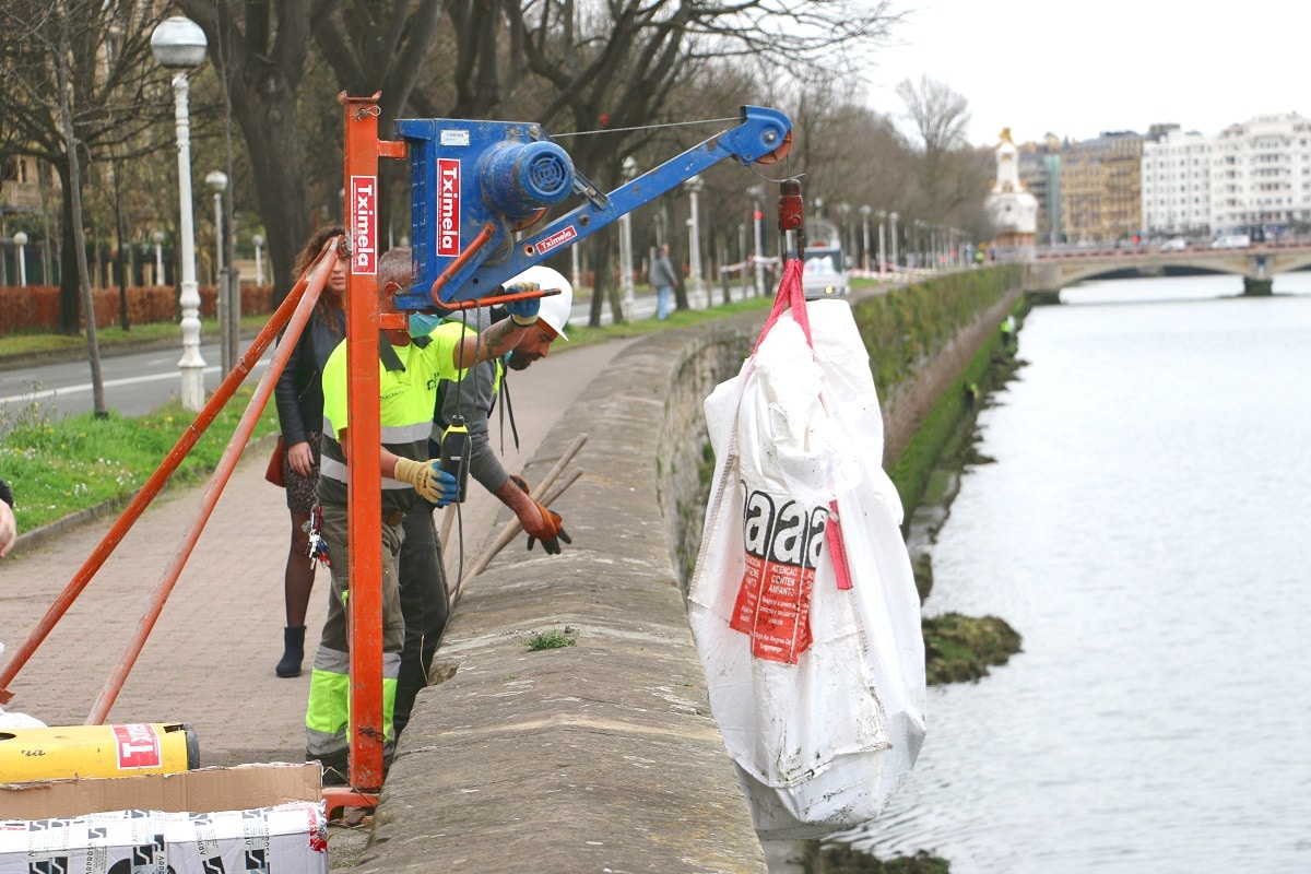El Ayuntamiento ha iniciado hoy «con los medios humanos y materiales adecuados» el operativo de recogida de los residuos depositados en el río Urumea, «concretamente entre los puentes de Mundaiz y María Cristina», ha subrayado el mismo Consistorio en nota de prensa. «Diez operarios de la contrata de limpieza, debidamente equipados con cascos, botas y petos, además de dos grúas y un camión para el traslado de las bolsas de material retirado trabajan durante la bajamar para limpiar el río, una operación que se prolongará durante varios días», ha señalado la concejala de Ecología, Marisol Garmendia.