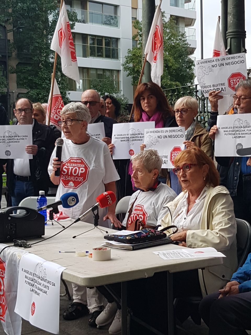 Stop Desahucios de Gipuzkoa insiste en que no dejará que María Ángeles, pensionista y avalista de 80 años, tenga que abandonar su casa ya pagada en Usurbil. Y utiliza el caso dramático de esta mujer como ejemplo de la precariedad que sufre este sector: «Tenemos que denunciar una vez más el drama de los avalistas, jubilados, de edad avanzada cuya vivienda ya pagada es la garantía de préstamo de sus hijos«, insistió la portavoz de la plataforma Rosa García durante la concentración del martes en Donostia.
