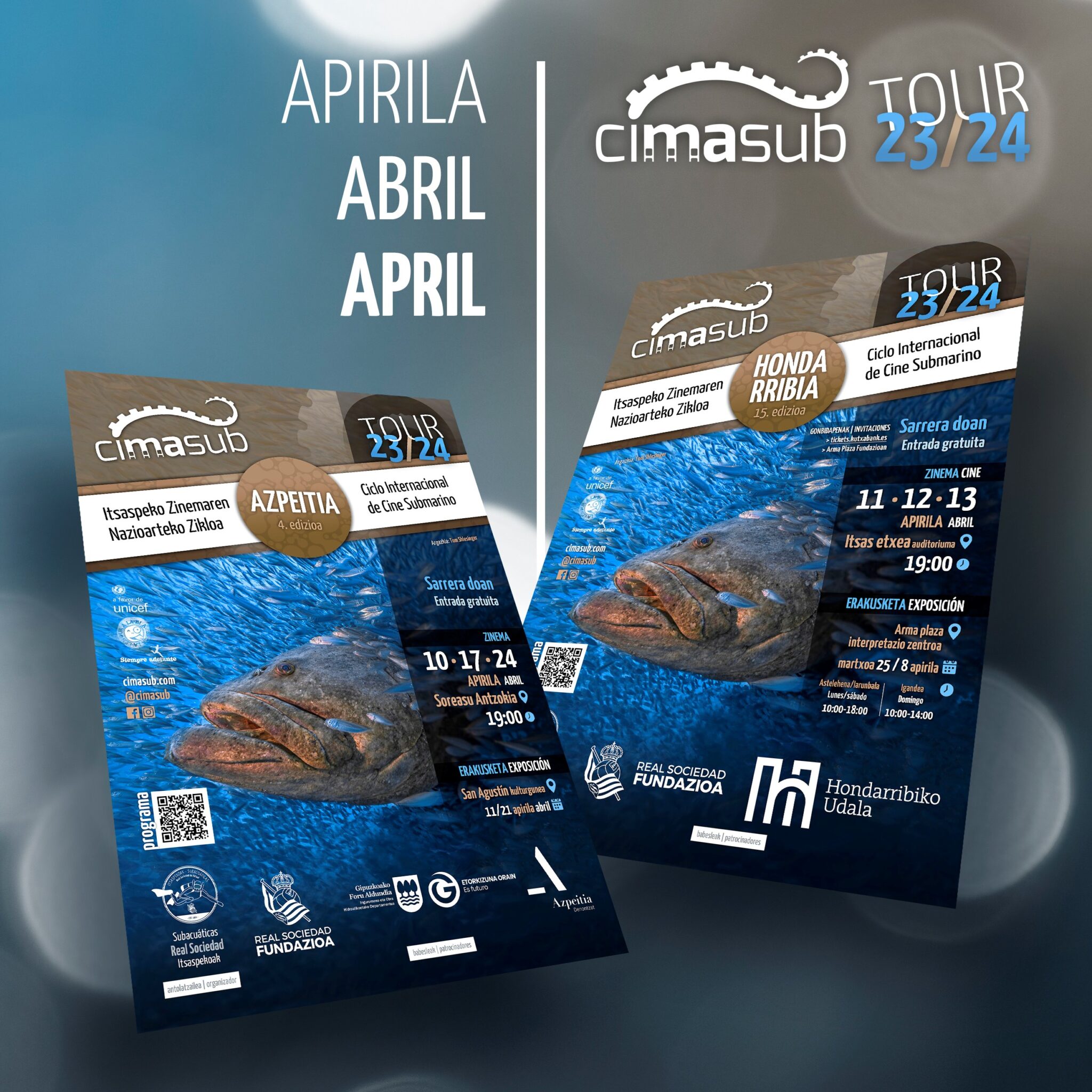 En Abril, el Ciclo Internacional de Cine Submarino, CIMASUB, llega a Azpeitia y Hondarribia. Los amantes del mundo submarino podrán disfrutar de la 4ª edición en Azpeitia, gracias al patrocinio del Departamento de Sostenibilidad de la Diputación de Gipuzkoa, que se llevará a cabo los miércoles 10, 17 y 24 de abril a las 19:00 horas en Soreasu Antzokia, mientras que la 15ª edición de Hondarribia, se realizará los días 11, 12 y 13 de Abril a las 19:00 horas en el Auditorium de la Itsas Etxea.