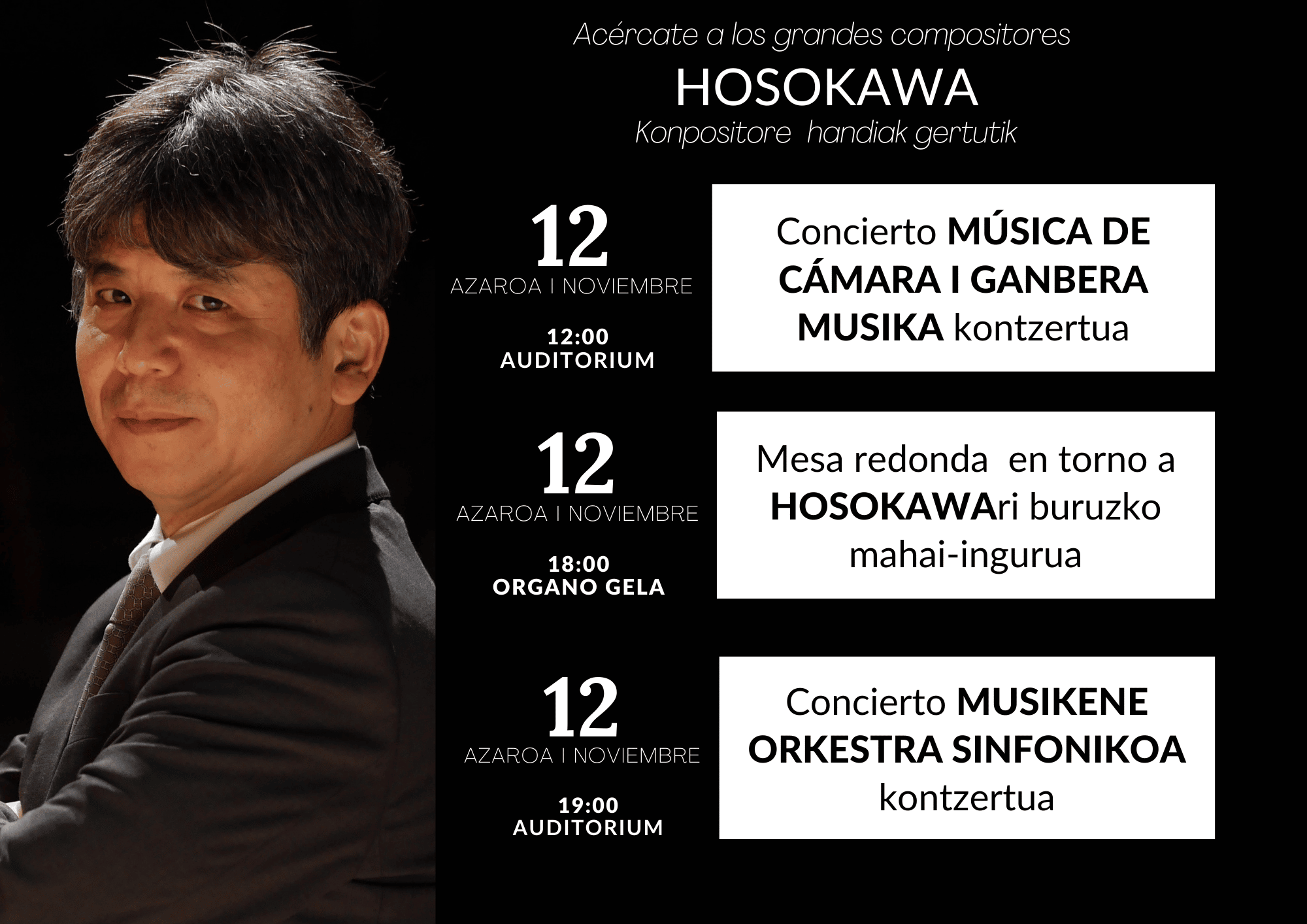 Además, el público podrá, acercarse a su música el sábado 12 de noviembre a las 12:00 horas en un concierto de música de cámara, donde sonarán exclusivamente las obras del compositor japonés.