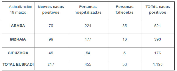 Son 217 nuevos casos en Euskadi hasta las 20 horas de ayer, es decir, 1.190 personas contagiadas en total. En Gipuzkoa son en total 176 contagiados y 54 están ingresados. Además en Euskadi ha habido 13 muertos más en las últimas horas hasta sumar 53.