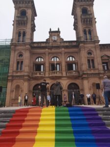 El Ayuntamiento de Donostia luce ya con los colores arcoíris con motivo del Día del Orgullo LGTBI que se celebrará este próximo domingo. Además responsables han leído hoy una declaración en que se comprometen a defender los derechos del colectivo.