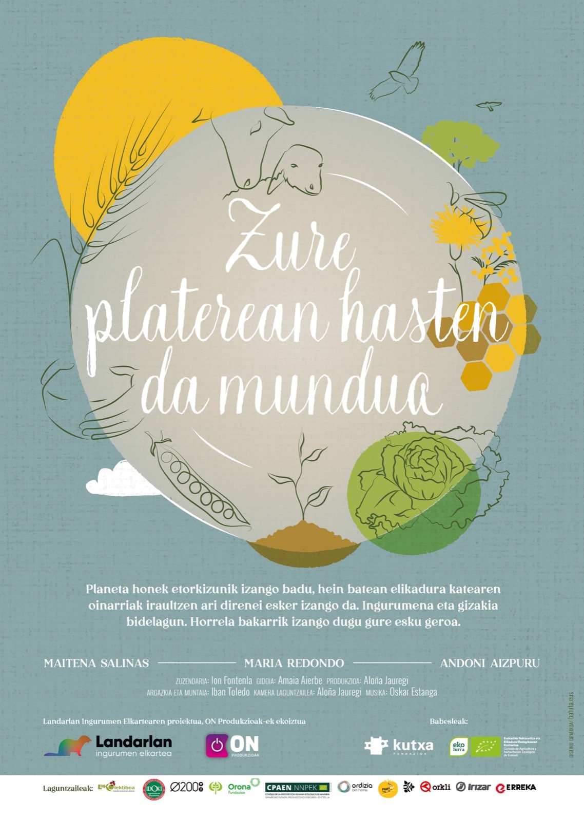 El pre-estreno del documental ‘El mundo comienza en tu plato’ será este próximo jueves en el auditorio del edificio Orona de Hernani este jueves a las 19:30 horas. Allí se reunirán asociaciones de consumo, cooperativas, productores, cocineros, actores, asociaciones ecologistas, partidos políticos, etc alrededor del trabajo que han llevado a cabo Landarlan Ingurumen Elkartea y ON Produkzioak.