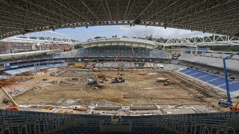 Con la izada esta mañana de la cercha este, el futuro estadio de Anoeta avanza a pasos gigantes. No sólo el exterior, también el interior, donde ayer se comenzaron a colocar los asientos de la grada del fondo sur.